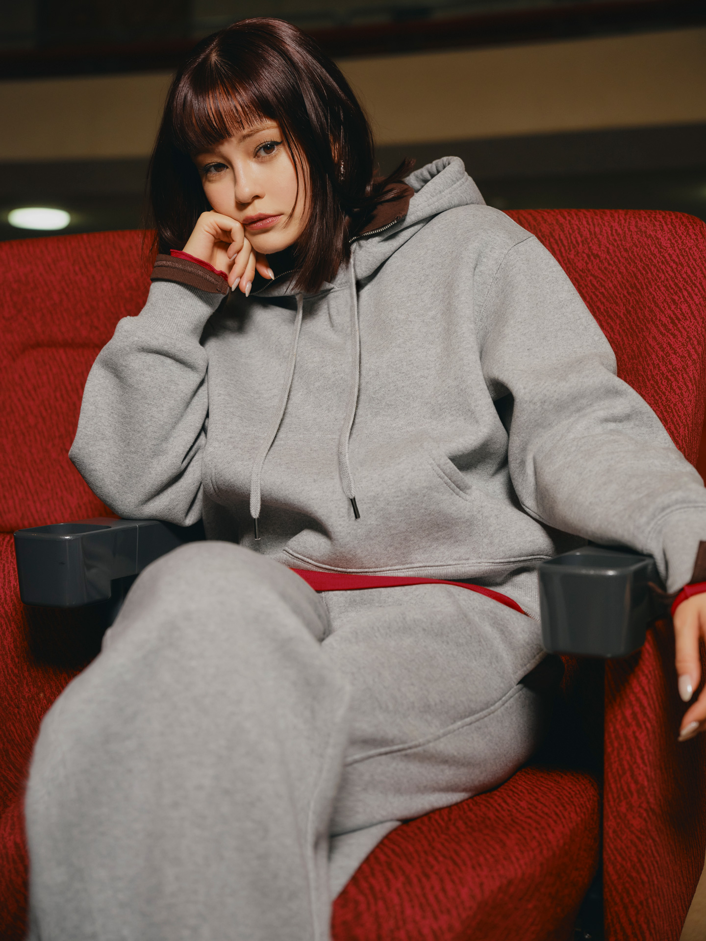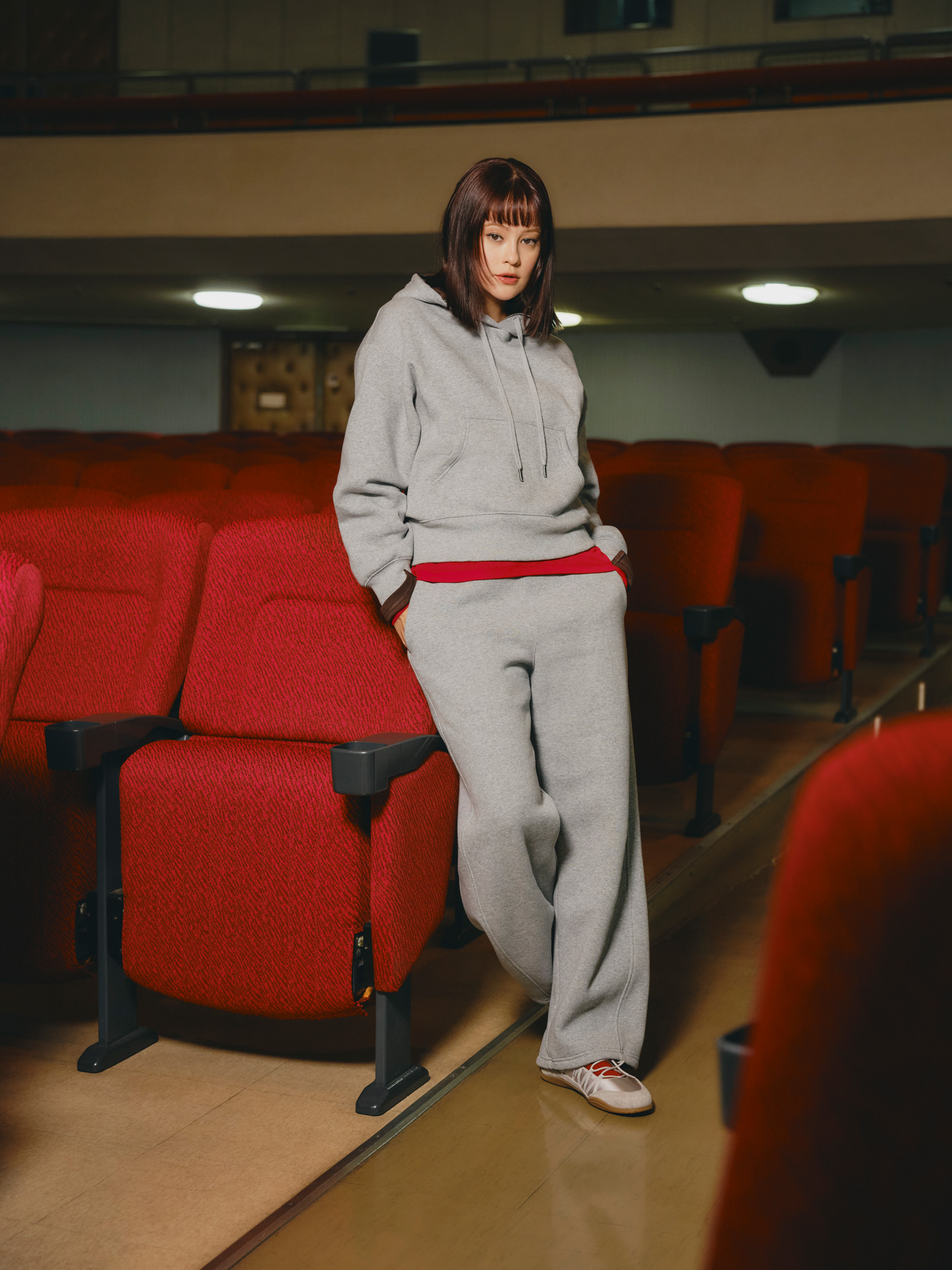 第2弾に登場するのは、モデル・emma (エマ)。都会の喧騒から少し距離を置き、スクリーンの淡い光に包まれる。何も考えず、映像の世界に身を預ける。そんな静かな時間には、適度な重みと端正さを併せ持つ「ヘビーウェイトスウェット」がしっくりと馴染む。