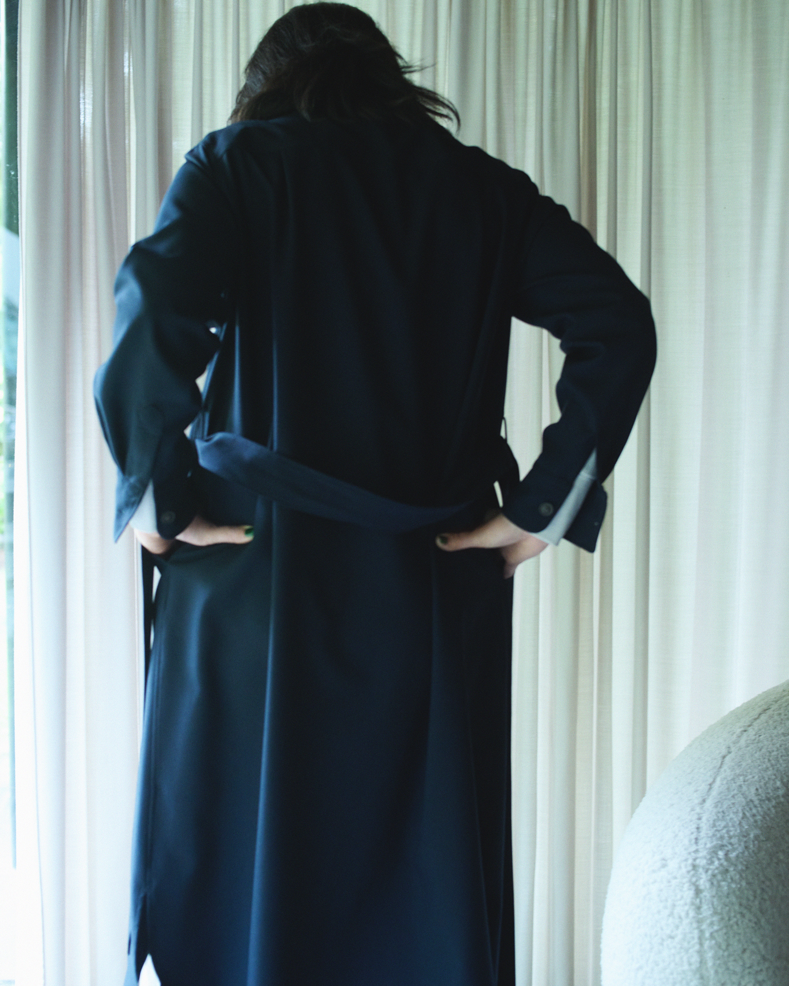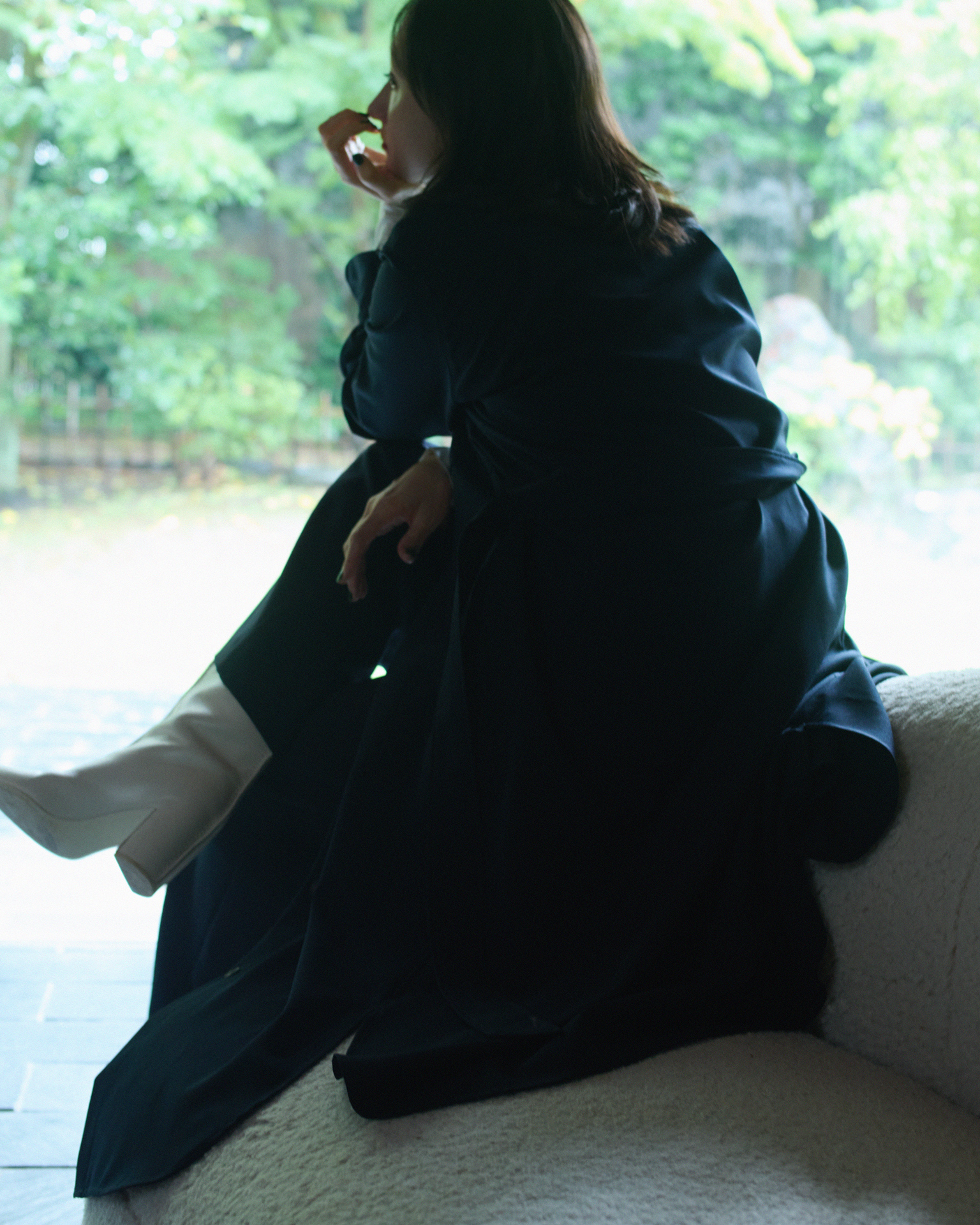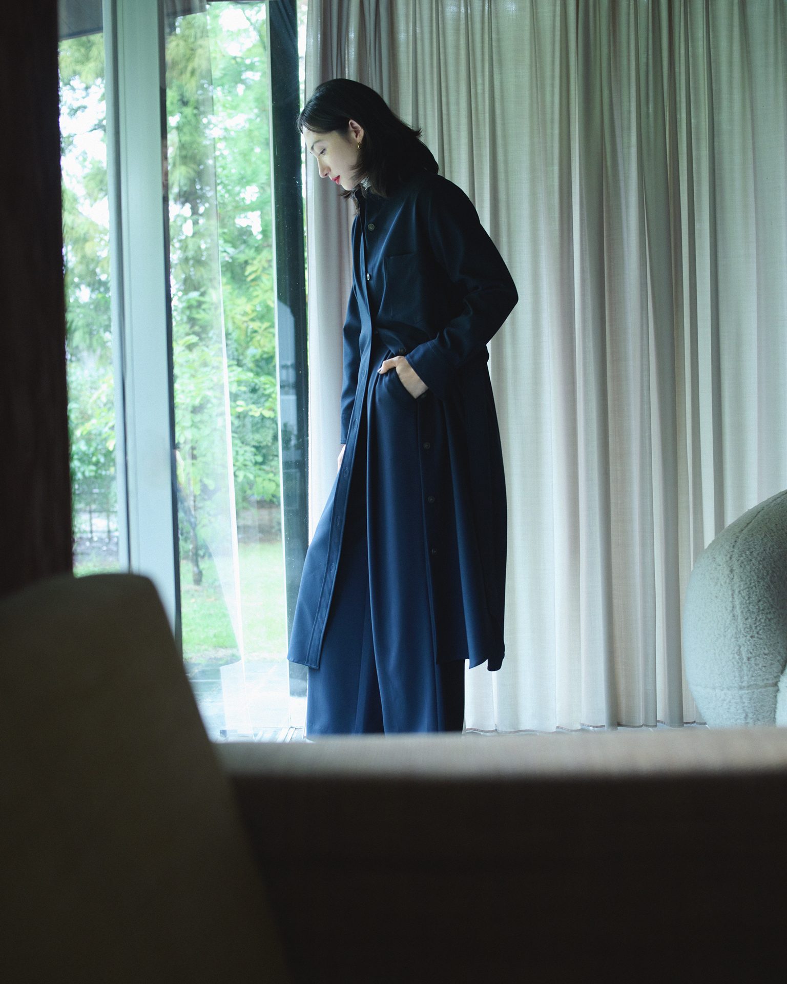 香椎が纏ったのは、ネイビーのソフトオックスシャツワンピース。伸縮性と張りを備えた生地はシャープな印象を程よく和らげ、しなやかな女性らしさを引き立てる。シワになりにくく、手洗いが可能という機能性も、日々を駆け抜ける大人に寄り添う。