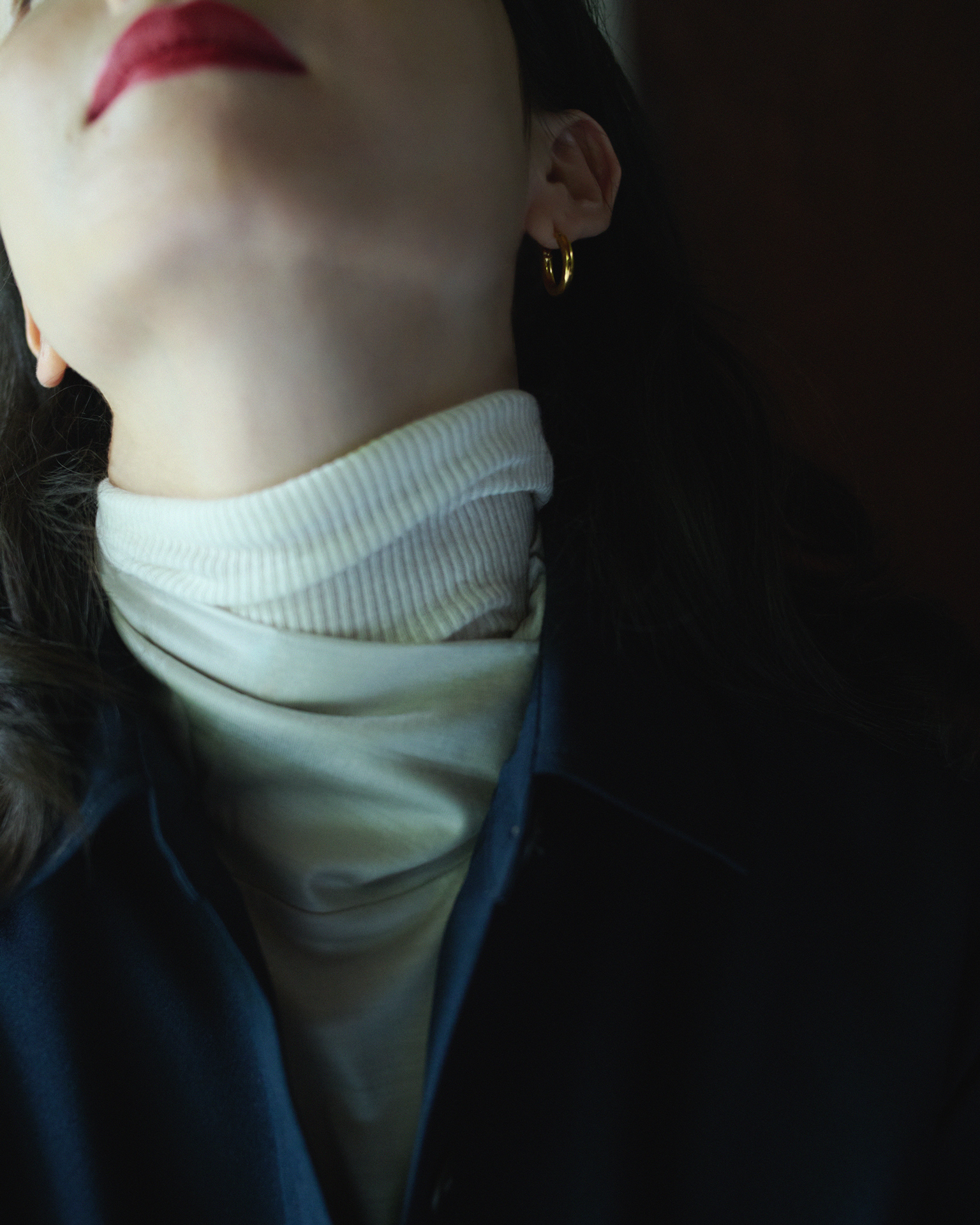 インナーには、SOÉJU のベストセラーであるカシミヤ混タートルネックカットソーをレイヤード。柔らかな肌触りが心地よく、重ねることでモダンな奥行きを生み出す。同色のタックワイドパンツを合わせれば、洗練されたムードを纏った統一感のあるスタイリングに。