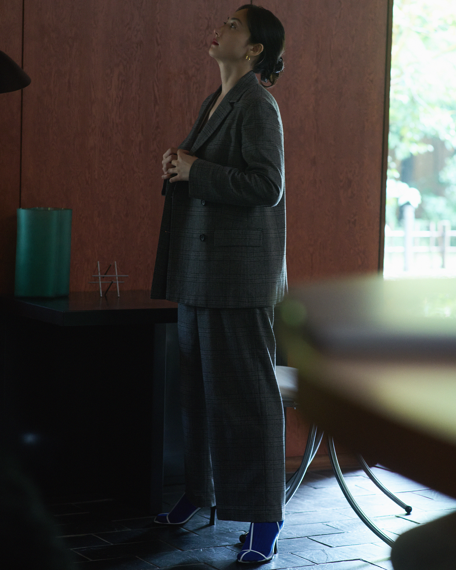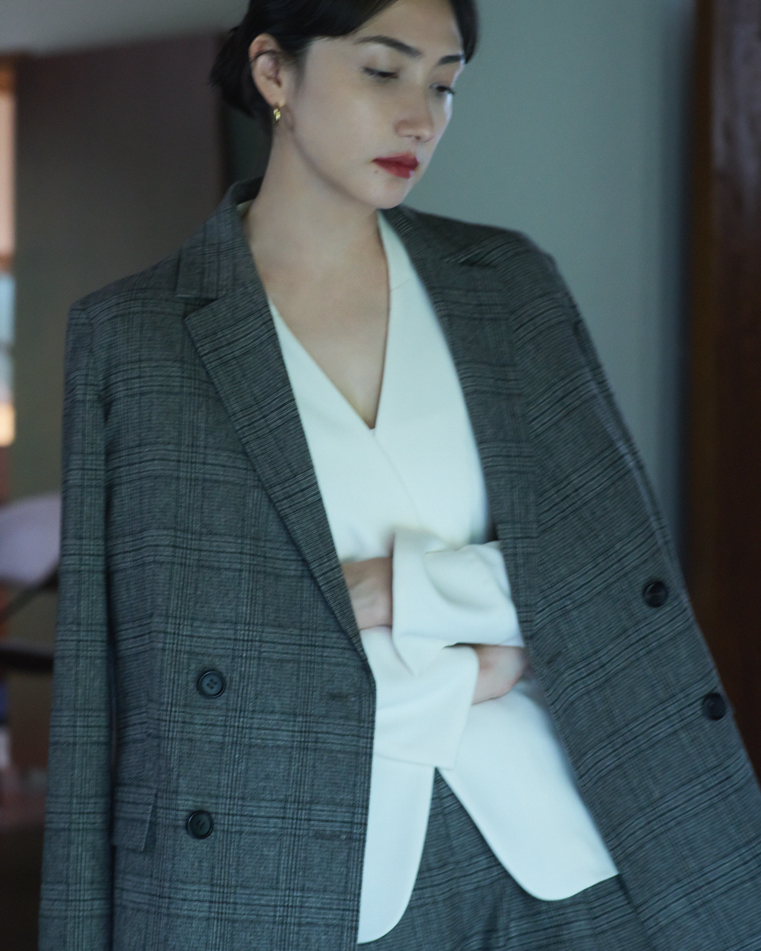 香椎は、同柄のグレンチェックタックワイドパンツを合わせ、定番の中に自分らしさを覗かせるスタイリングに。すとんと落ちるタックラインが腰まわりをすっきりと整え、裾へと向かうしなやかな広がりが、彼女の動きに品を添える。