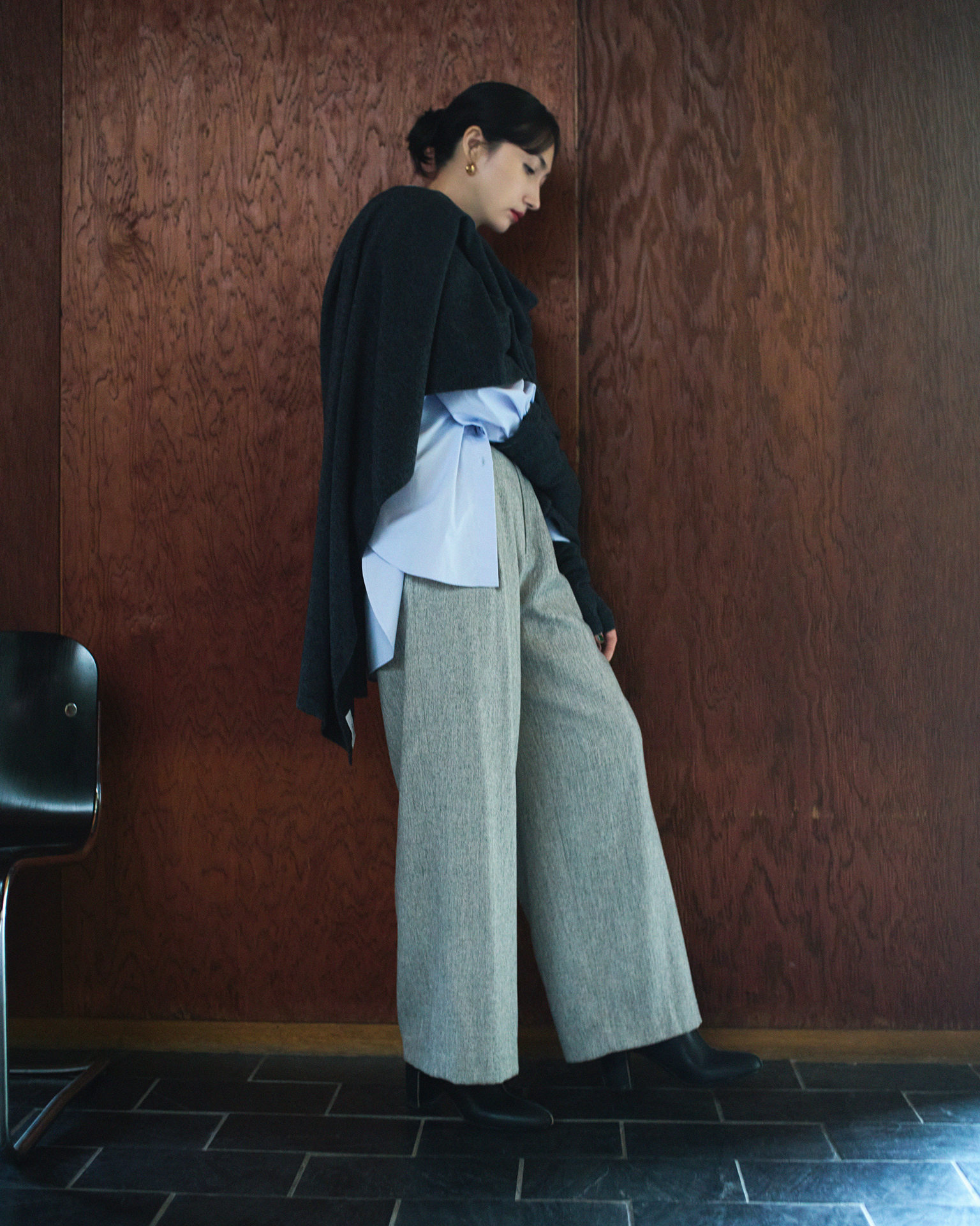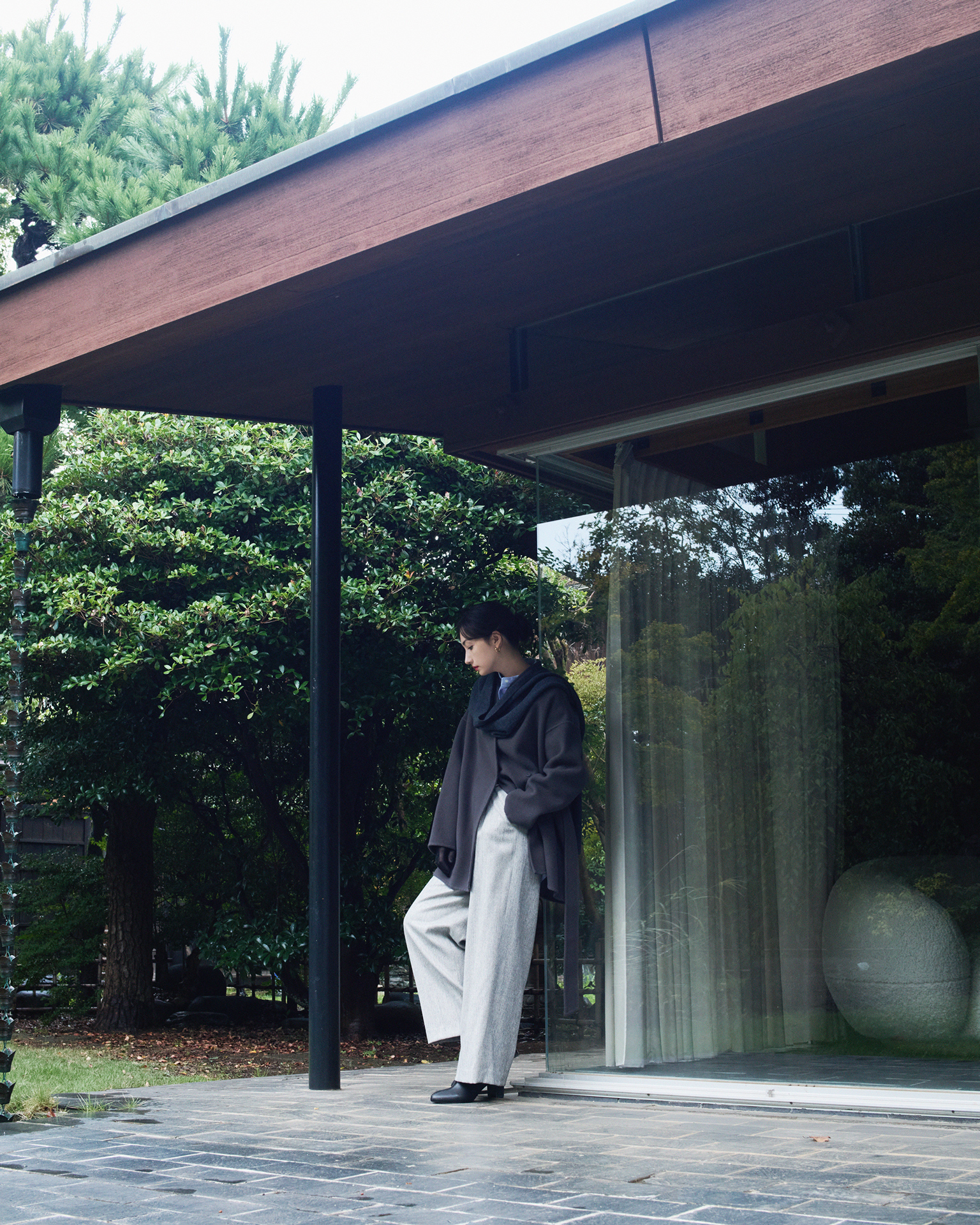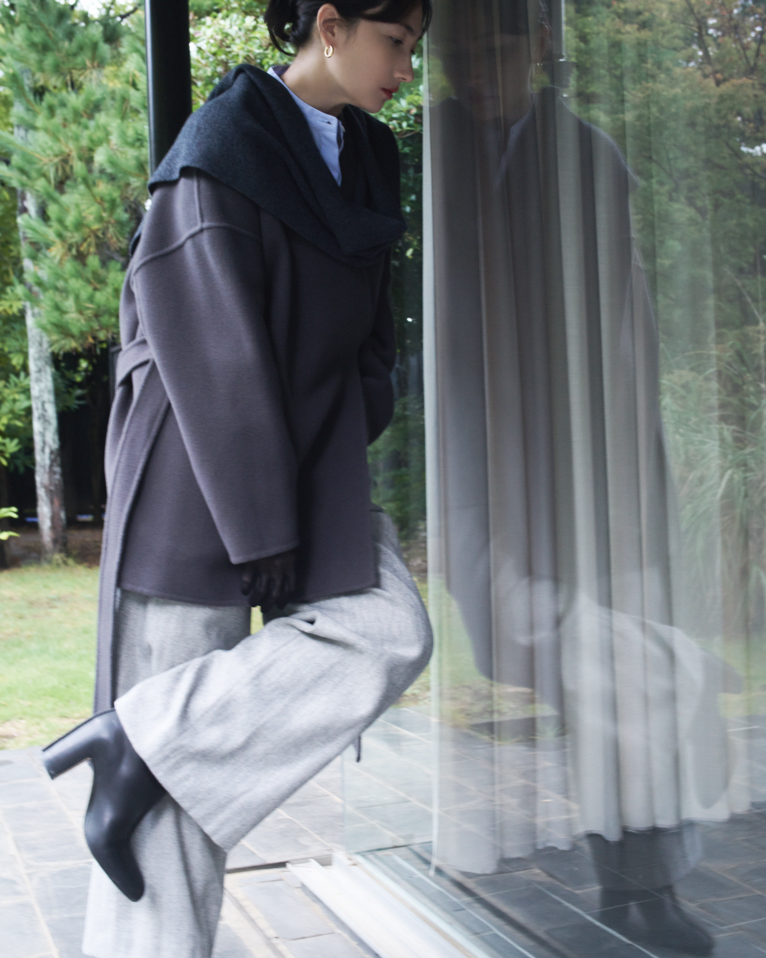 パンツ¥18,700、コート¥36,300、中に着たシャツ¥14,300、ストール¥15,400/すべて SOÉJU、その他/スタイリスト私物