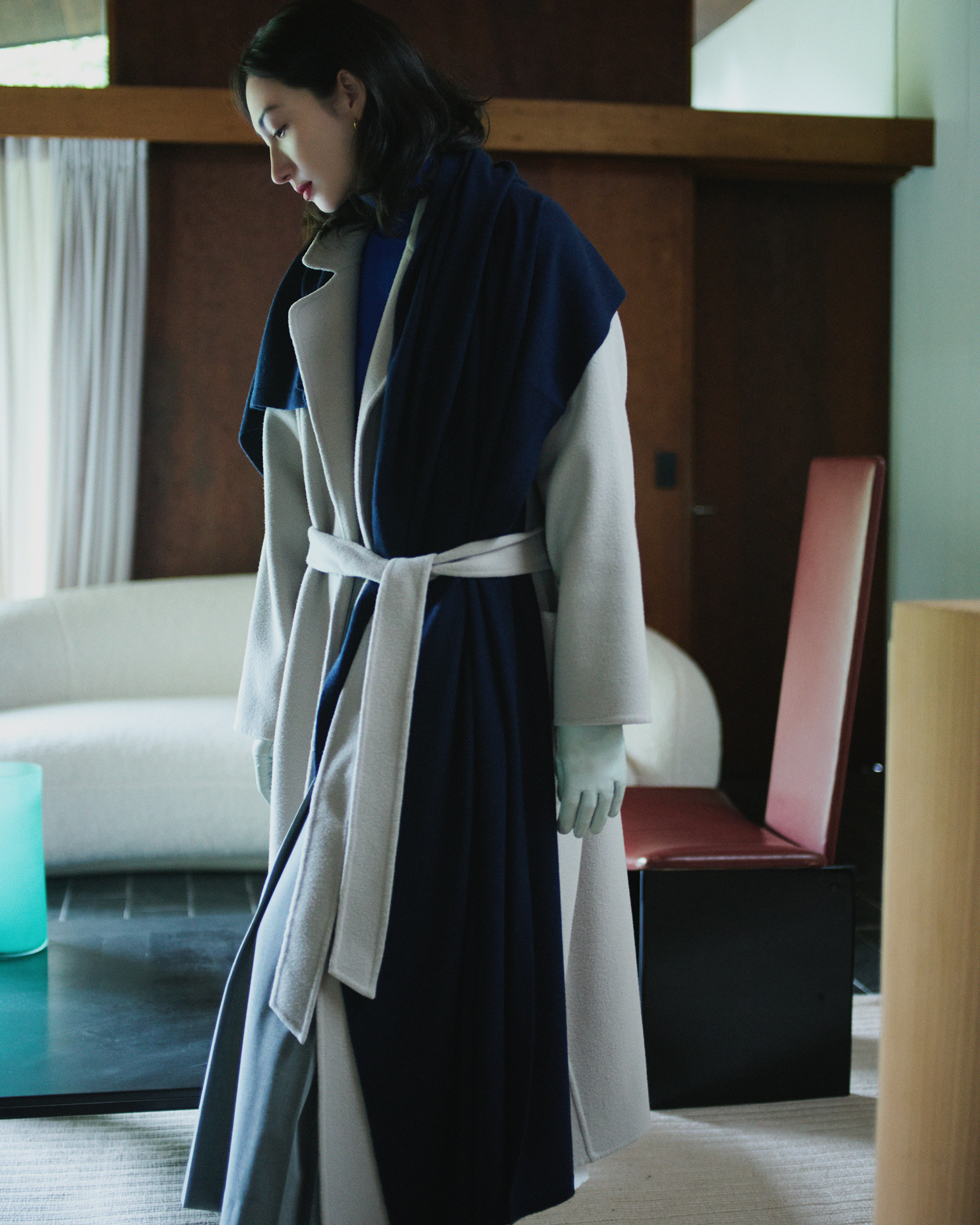 マシュマロのように柔らかな肌触りが多幸感をもたらすウールリバーローブコートは、身体のラインに寄り添う美しいシルエットが魅力的。肩線のないラグラン袖はインナーにジャケットなどを着用した際にもシルエットが美しく保たれるように設計されている。また、世界有数の羊毛産地であるオーストラリアの希少な原料を厳選し、高密度に織り上げた二重織の生地に、尾州の伝統的な起毛加工を施すことで、空気をはらんだ軽やかな膨らみを実現。SOÉJU こだわりの上質な温もりを纏いながら、日常に静かな幸福を添えてくれる一着だ。
