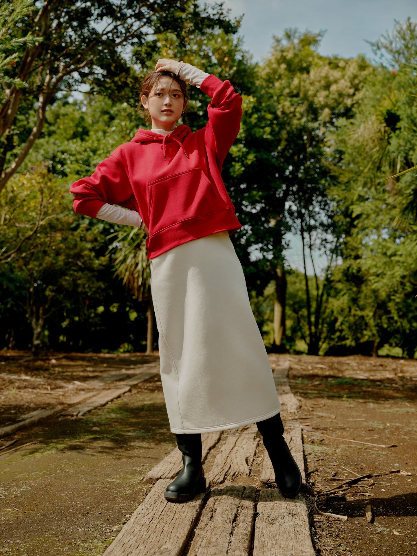 ヘビーウェイトスウェットショートパーカ¥2,990、中に着たソフトシアークルーネックティー¥990、ソフトシアーハイネックティー¥990、ヘビーウェイトスウェットナロースカート¥2,490、ロングブーツ¥5,990、ハートフープノンホールピアス&イヤーカフ¥590、ローズ&メタルリング¥590/GU (ジーユー)