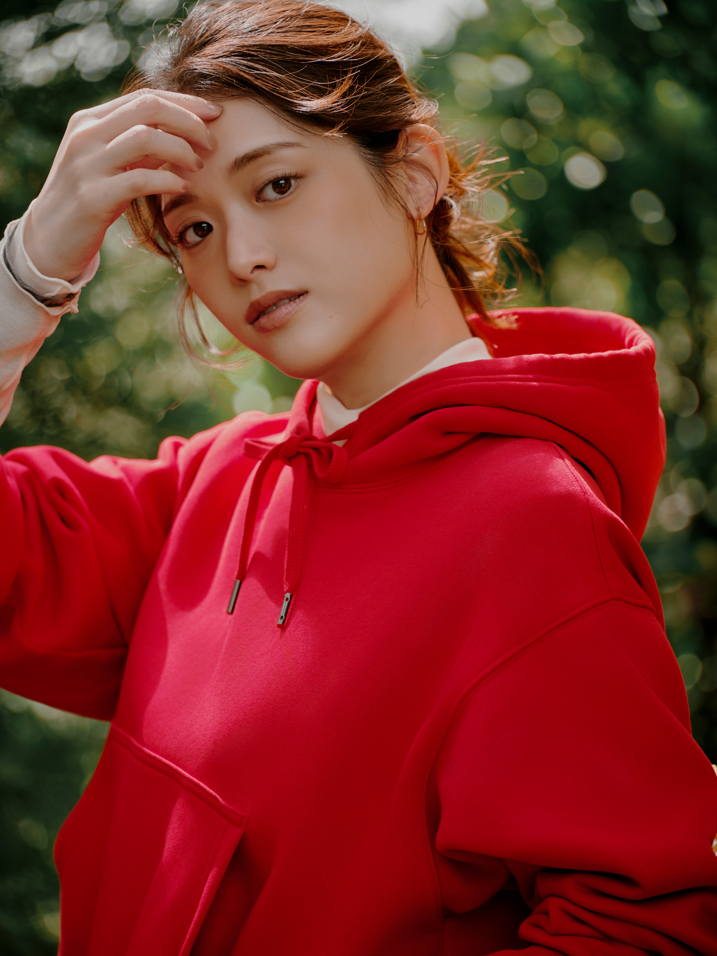 第4弾に登場するのは、松村沙友理。澄んだ空気と柔らかな光に包まれる秋の午後、ふと足を止めて空を見上げる。鮮やかな色が気持ちまで前向きにしてくれる「ヘビーウェイトスウェット」は、存在感がありながらも着る人らしさを引き立ててくれるアイテム。