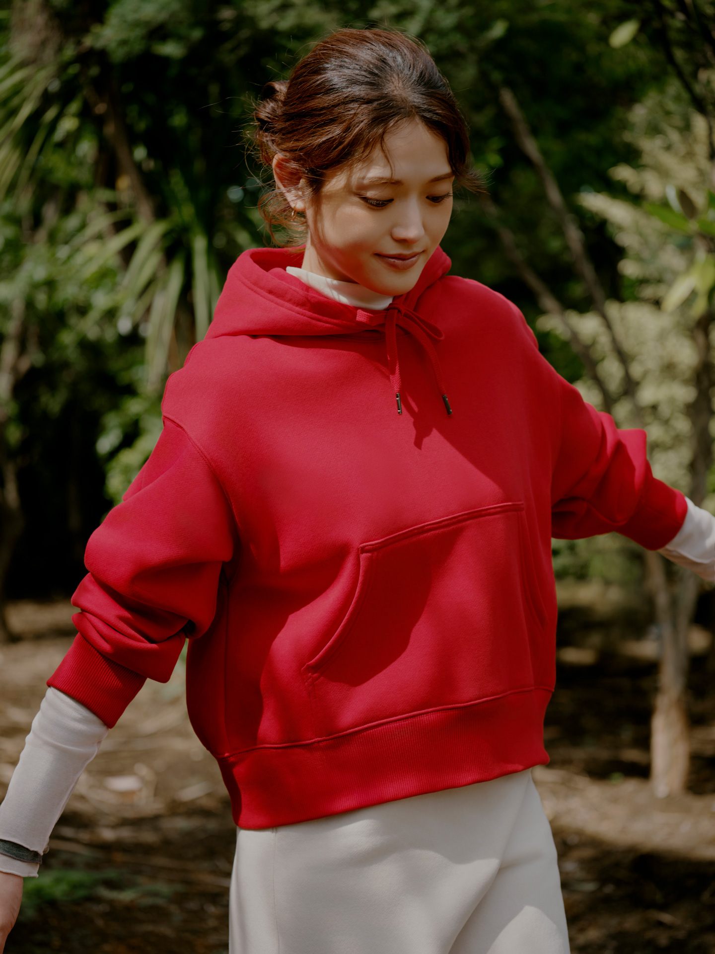 レッドのヘビーウェイトスウェットショートパーカは、発色がすごくきれいでした。鮮やかだけど浮かない、寒い季節に着たくなる色味で、しっかりした生地感も魅力。ラフすぎず、きれいめに着られるところも嬉しかったです。グレーのパフスウェットプルオーバーは、ゆったりしたシルエットが可愛くて、今回の撮影でもインナーにフリルを合わせたり、様々なスタイリングができそうだなと思いました。シンプルだけど着回し力があるのがいいですね。