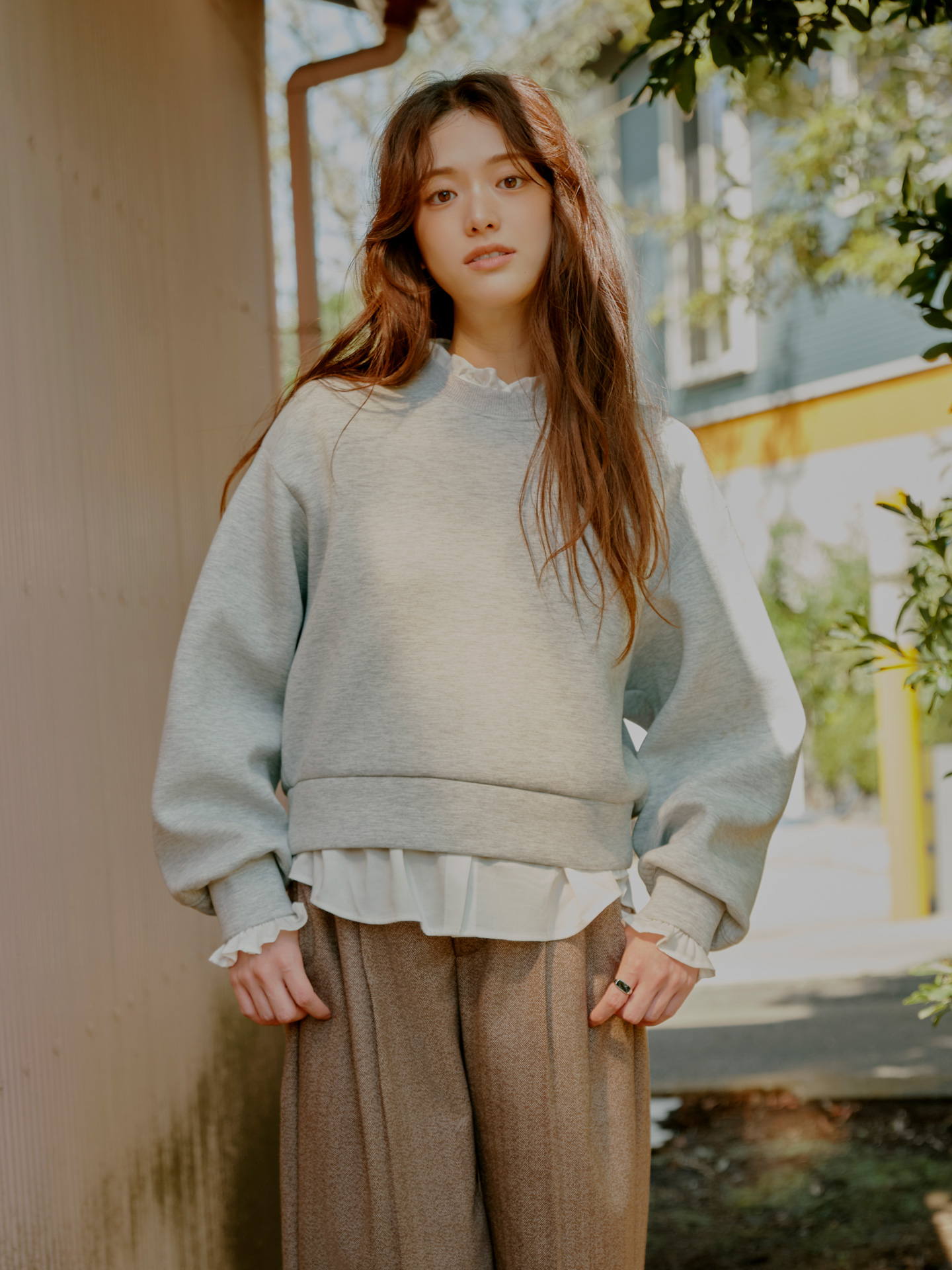 甘めのファッションが好きなので、スウェットは“外しアイテム”として取り入れることが多いです。フリルやレースのアイテムと合わせて、バランスを楽しんでいます。特に裏起毛のスウェットが好きで、今回着用したフーディーも普段からよく着るアイテムだったので、すごく馴染みがありました。