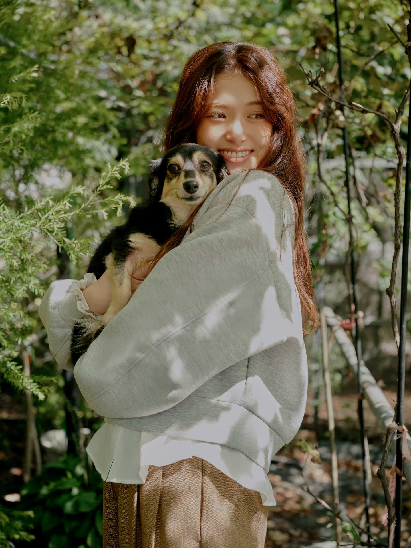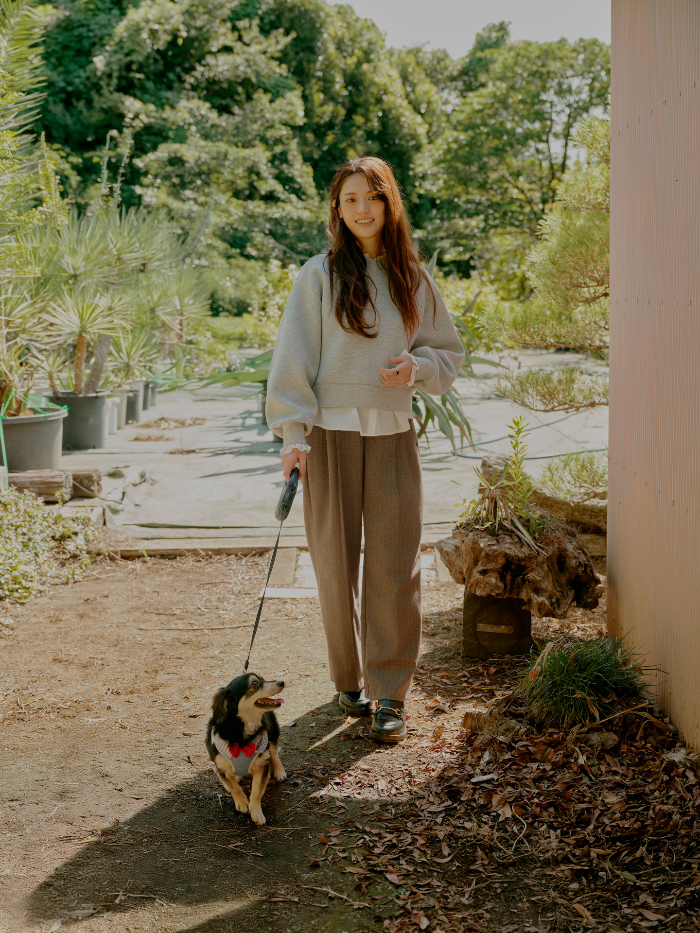 陽だまりの中、愛犬とのんびり過ごす穏やかな時間には、軽やかな着心地とふんわりとしたフォルムが心地よい「パフスウェット」がぴったり。何気ない日常の一場面も、自分らしく装うことでちょっと特別に変わっていく。そんな彼女のスウェ活に、GU のスウェットがさりげなく寄り添っている。