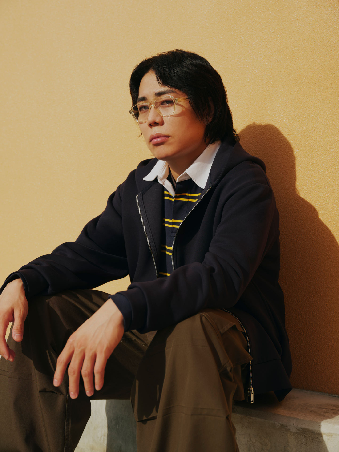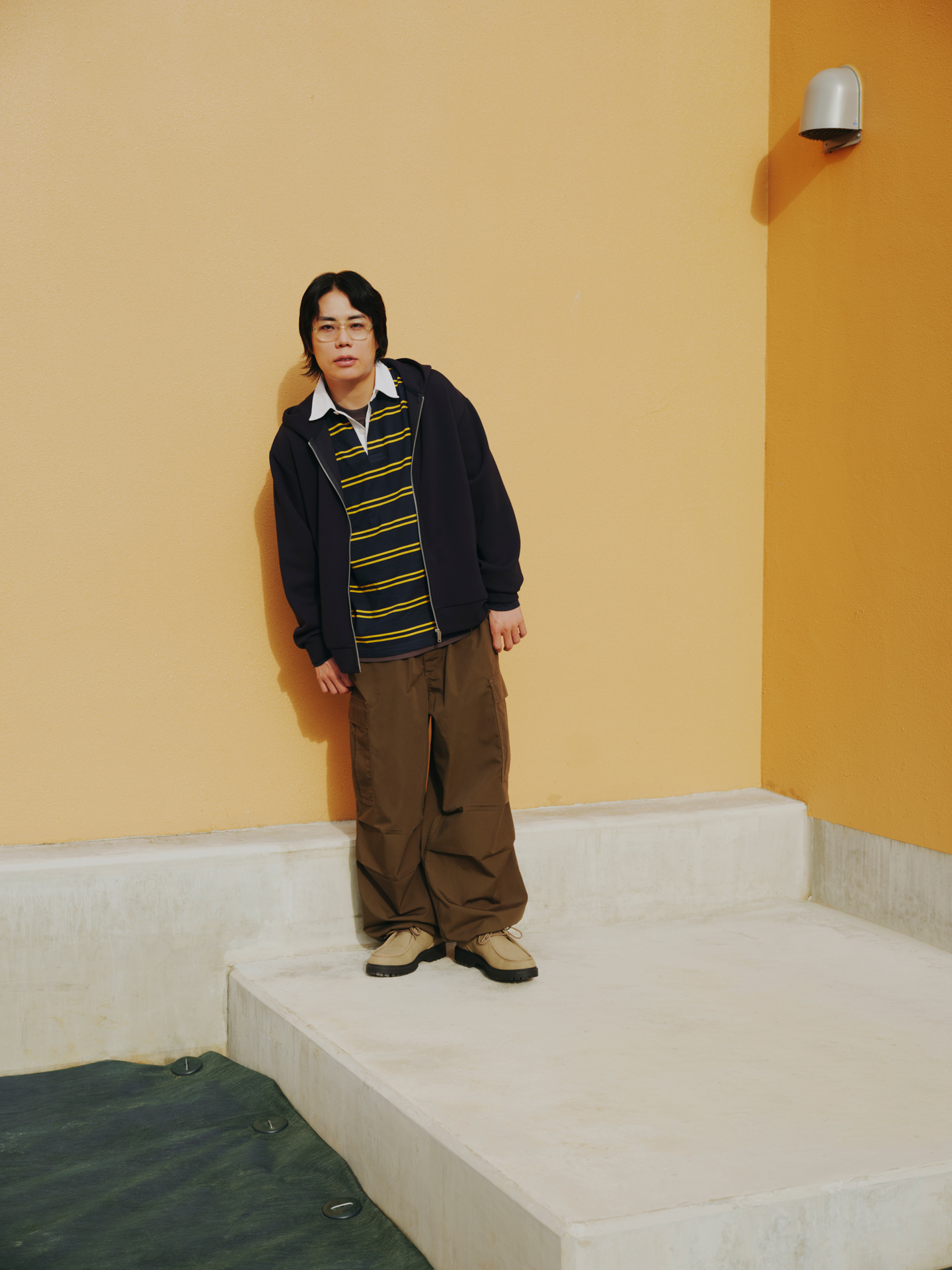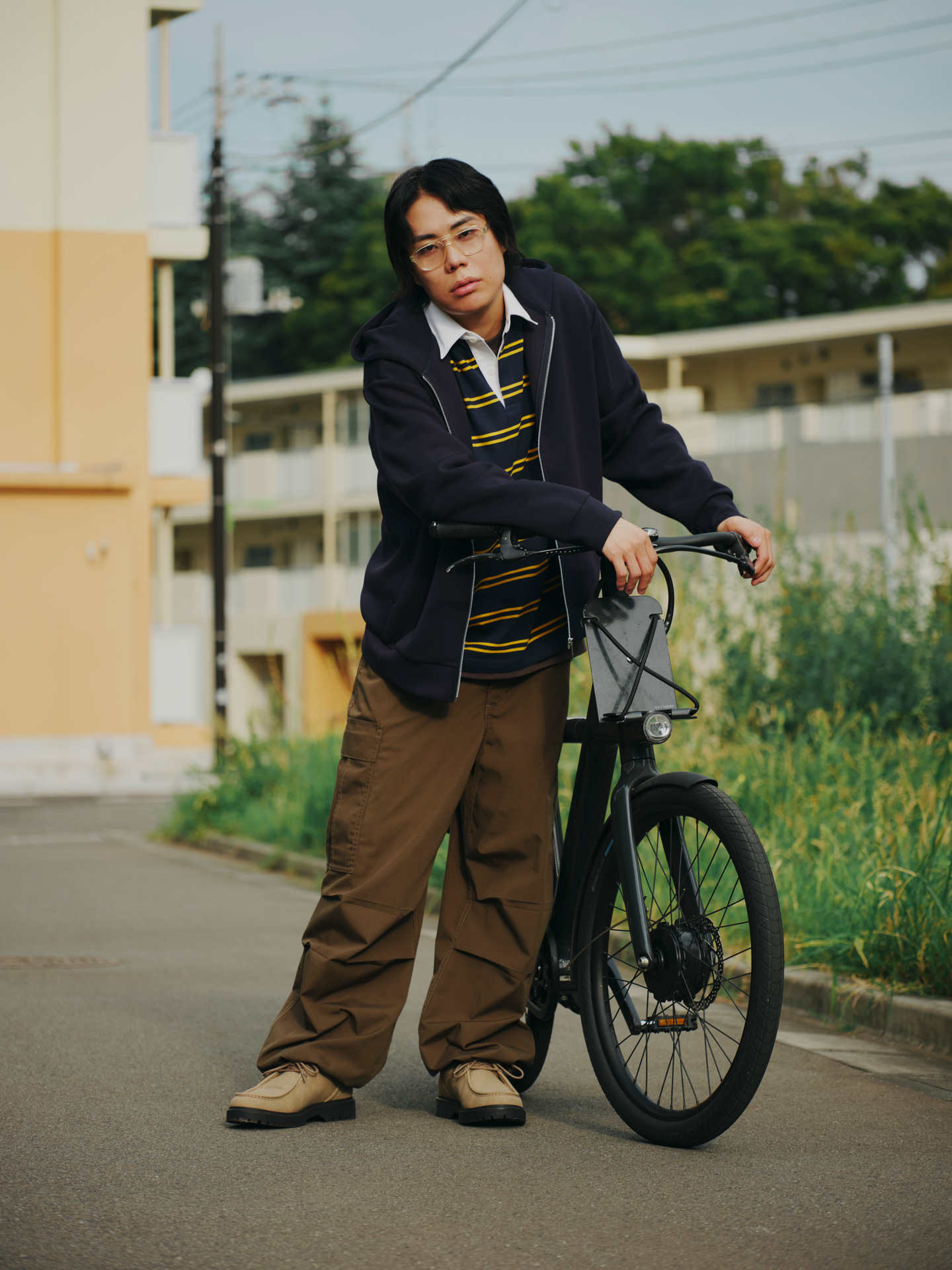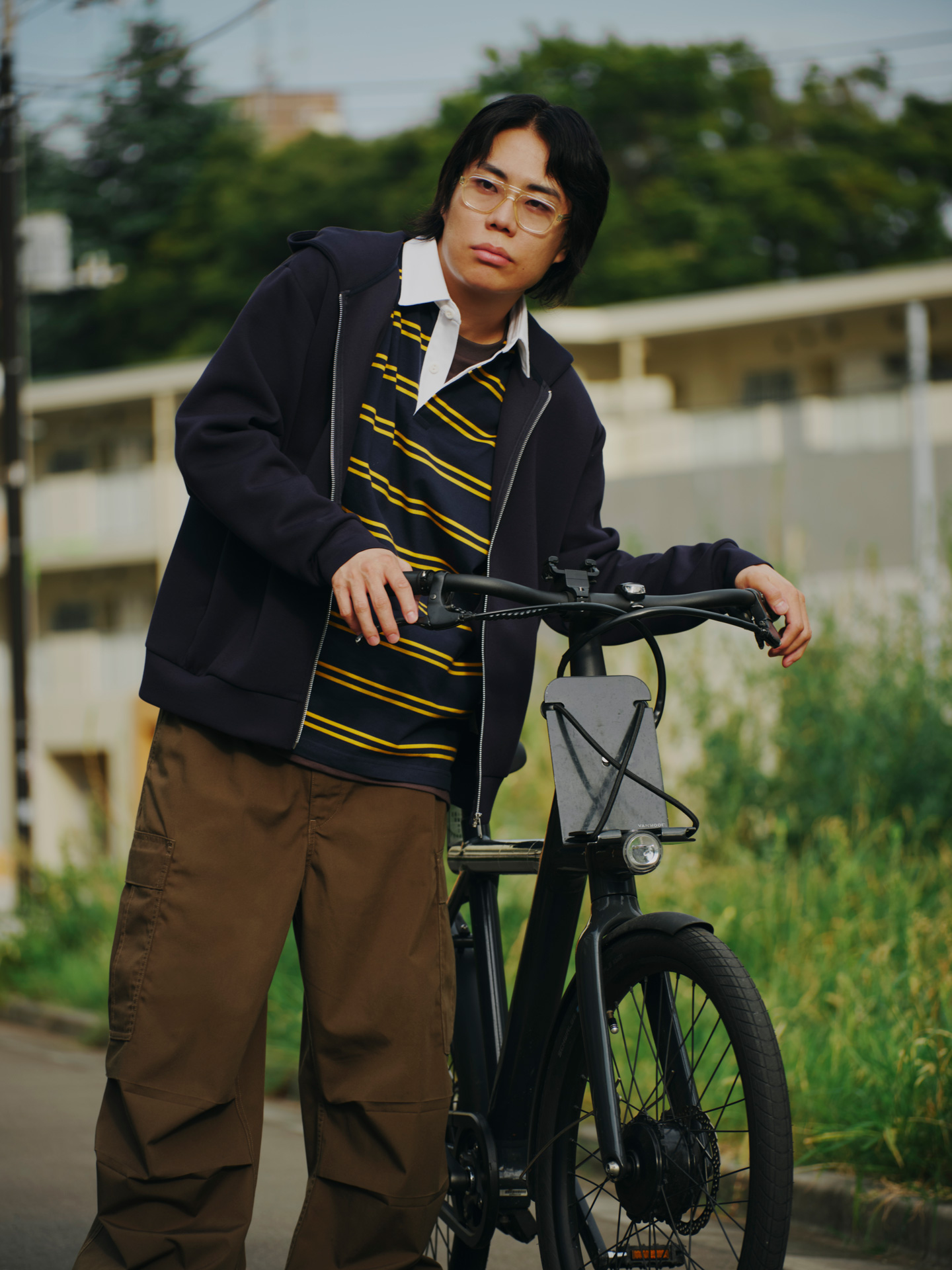第5弾に登場するのは、お笑い芸人・高比良くるま。穏やかな秋晴れの午後、気ままに自転車で散策。ペダルをこぎながら、頭の中には新しいネタのアイデアがぽつりぽつりと浮かぶ。落ち着いたカラーとシンプルなデザインが魅力の「ヘビーウェイトスウェットパーカ」は、そんなひとり時間にもぴったりの相棒だ。動きやすさと上品さのバランスが絶妙で、アクティブなシーンにも頼れる1着。