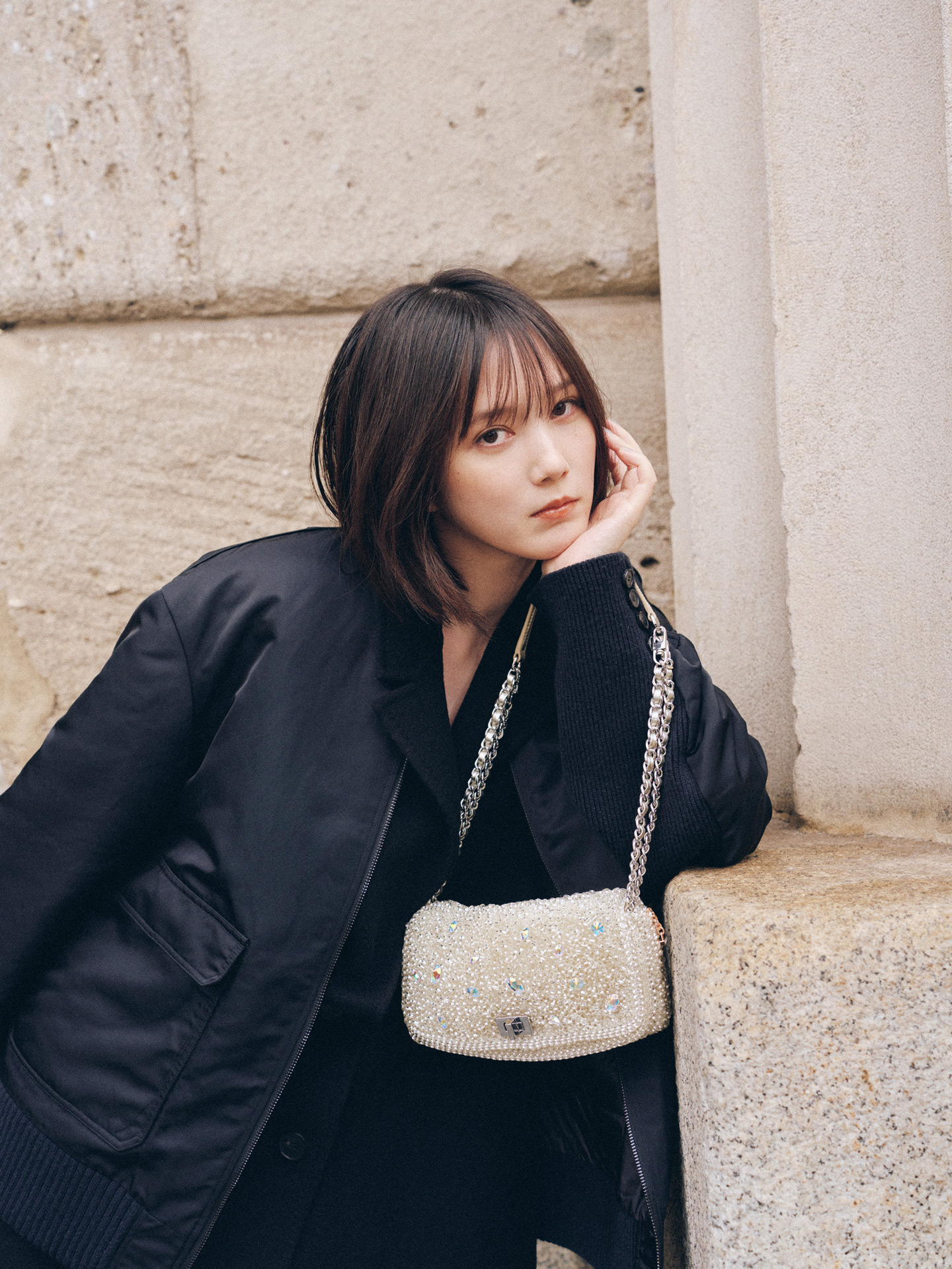 オーバーサイズのジャケットに、ミニスカートを合わせたルックに映えるのは、光そのものを編み上げたような「999 COLLECTION II (999 コレクション II)」。99.9%の純銀を用い、職人の手仕事で編み上げられた特別なシリーズに、クリスタルやガラスビーズを贅沢にあしらった新型が登場。シャープなフォルムと繊細な輝きが呼応し、ストリートと端正さが交差するような独自のムードを放つ。手にするだけで、装いに光を与えるジュエリーのようなバッグが冬の装いをアップデートする。