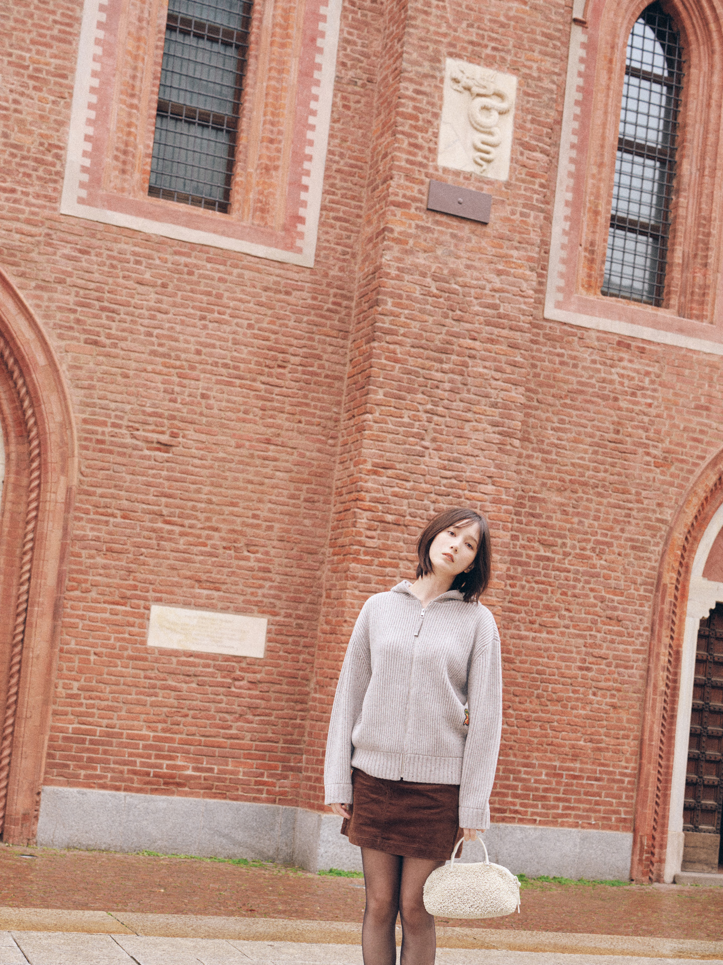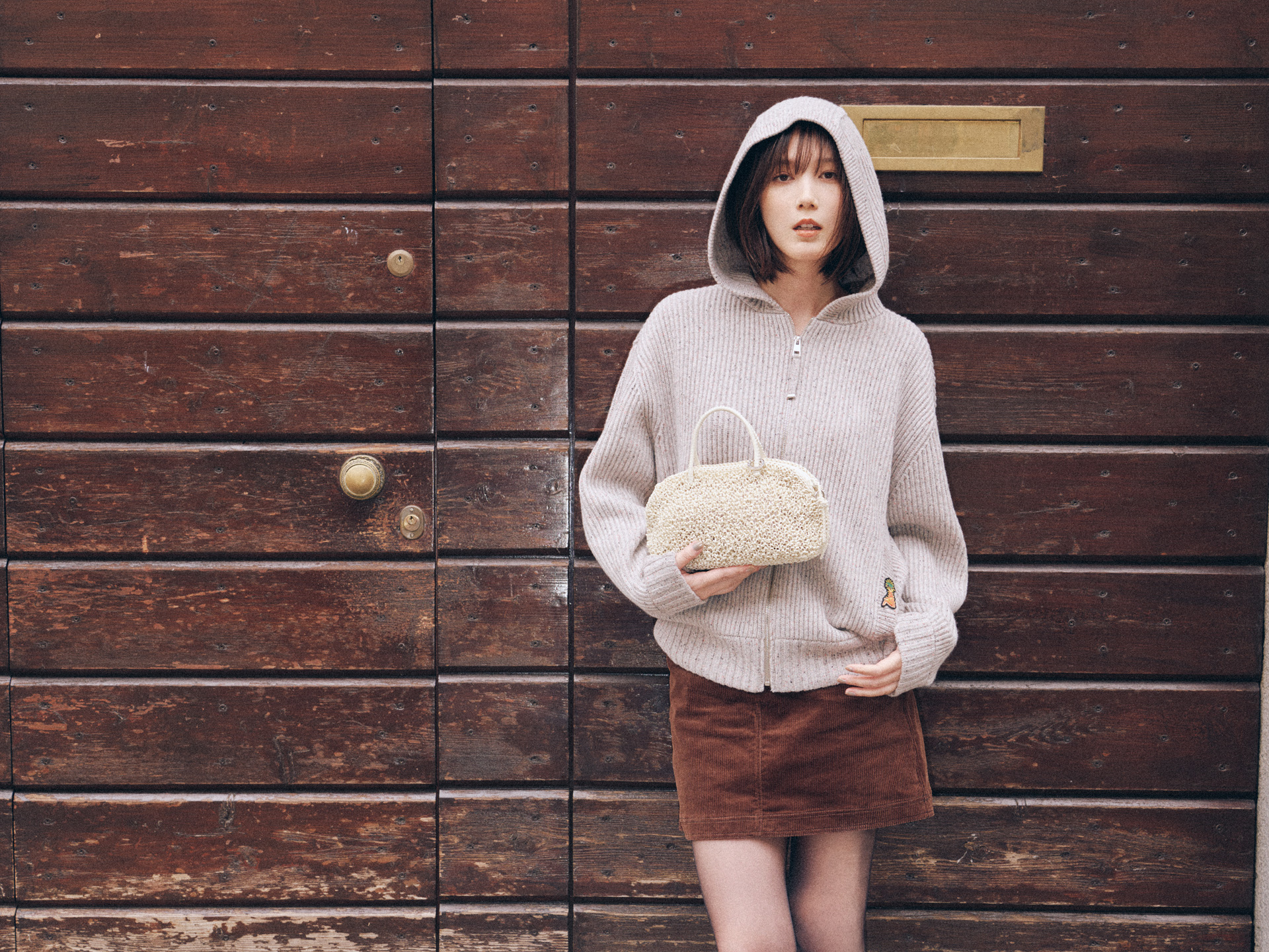 柔らかなリブニットのフーディに、深みのあるブラウンのコーデュロイミニを合わせ、異素材の質感が穏やかに響き合う。そこに寄り添うのは、オーバルフォルムが印象的なボストンバッグ「CONFETTO (コンフェット)」。ワイヤーコードの引き手が洗練されたフォルムに軽やかなアクセントを添え、編みの立体感が光を柔らかく反射する。確かな存在感を宿すその佇まいは、手にする人の感性を映し出すように、美しく息づく。