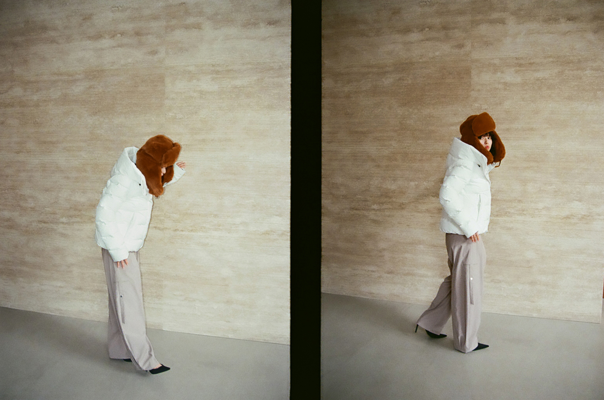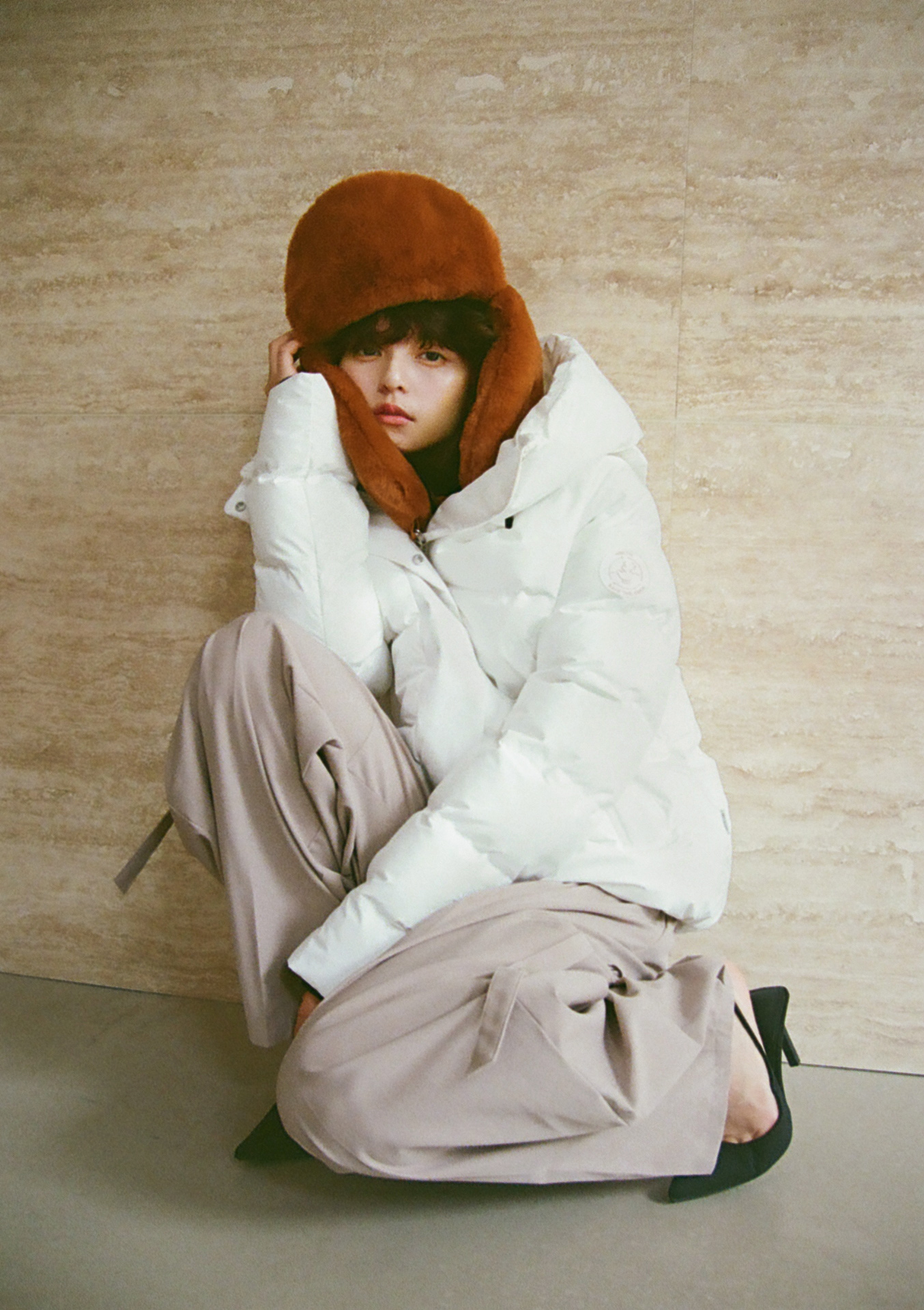 冬景色に溶け込むような純白のジャケットは、中綿に動物由来成分不使用の再生素材「RECYCLED PLUMTECH®」を使用することで、–20度の寒さにも耐える保温性と防風・撥水機能を備えた頼もしい一着。女性らしいコンパクトなシルエットに、裾やフードの調整機能、2WAYジッパーが快適さを高め、都会からアウトドアまで幅広いシーンに寄り添う。シンプルながらも存在感のあるジャケットスタイルに、エコファーのフライトキャップを合わせて、唯一無二の個性が光る着こなしに。