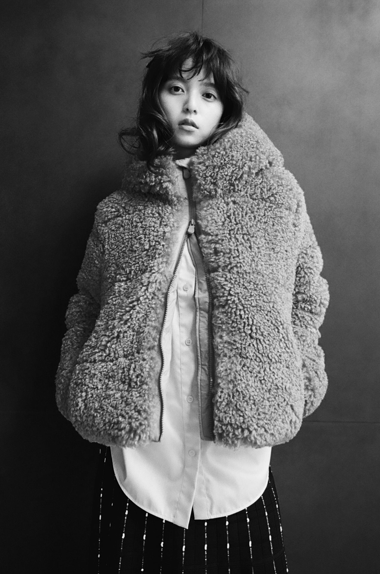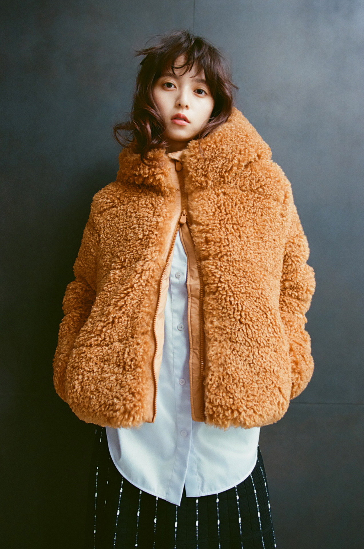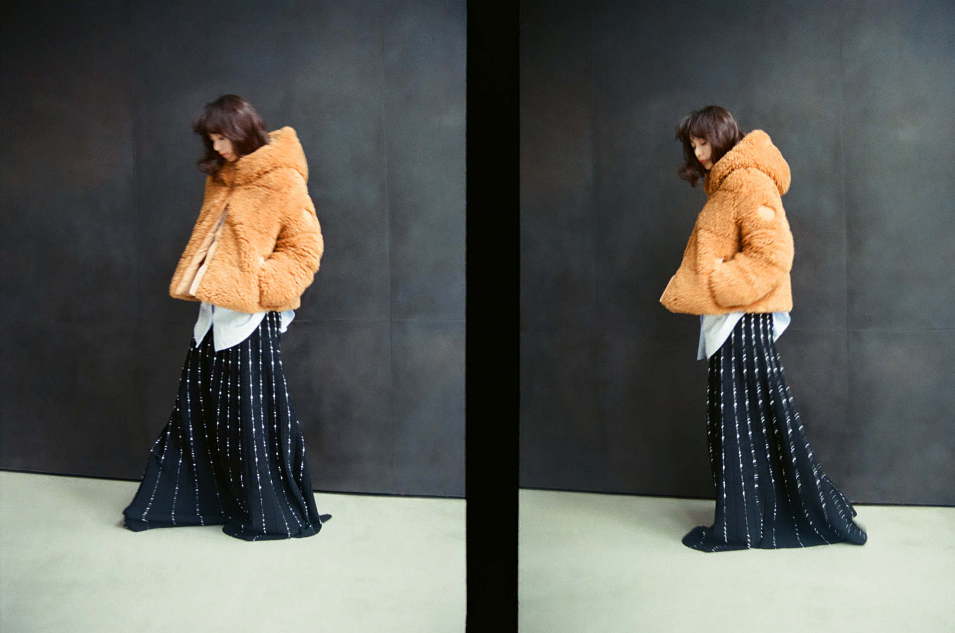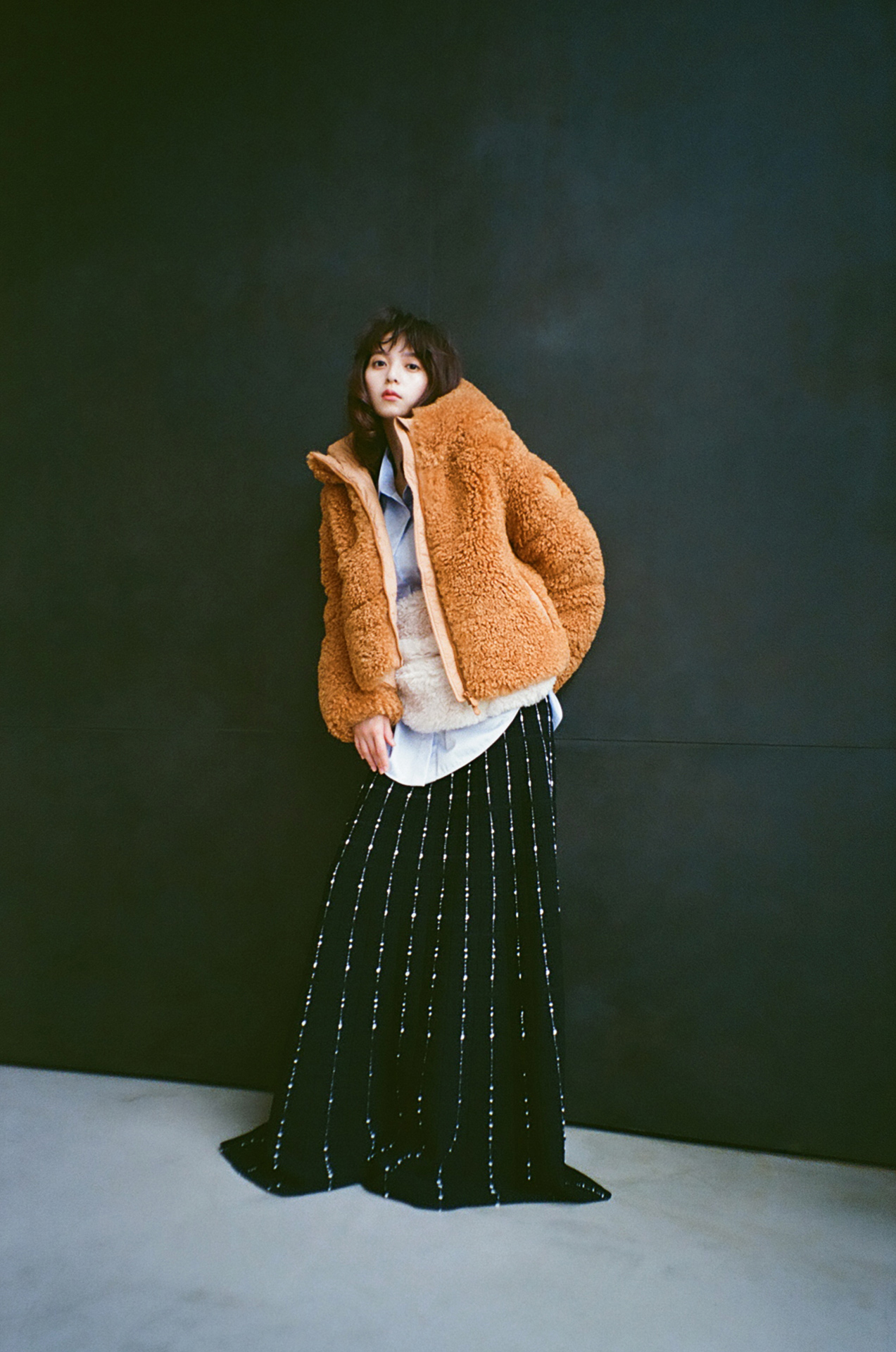 目をひくボリュームたっぷりのシルエットのテディボアジャケットは、キャメルの色調がやわらかな温もりとリラックス感をもたらし、冬の街で存在感を発揮。ボアは100%リサイクルポリエステル素材を使用しており、ふっくらとした軽さと心地よい暖かさを実現。齋藤はエレガントに広がるマキシ丈スカートで、モードな余白を感じるスタイリングにアップデート。シルエットの妙が、装いにより一層深みを添えてくれる。