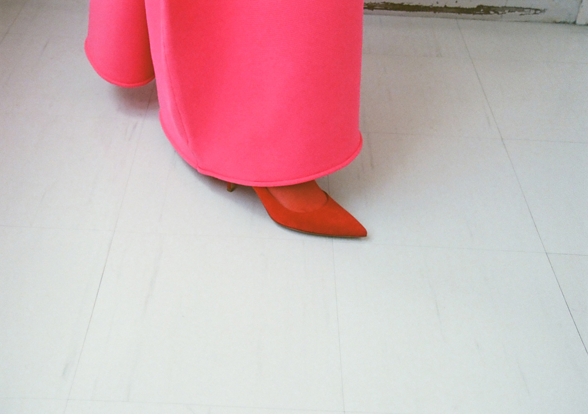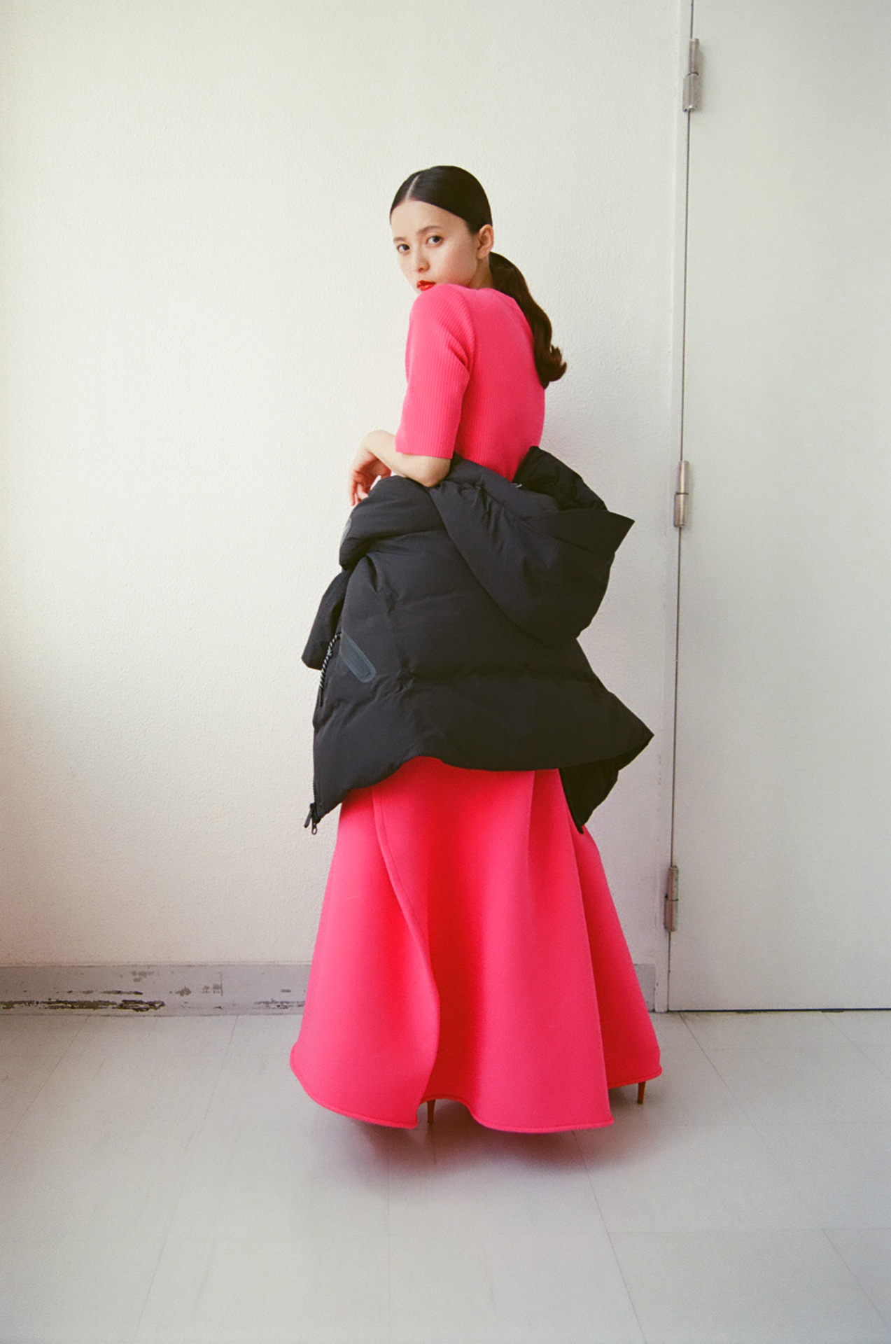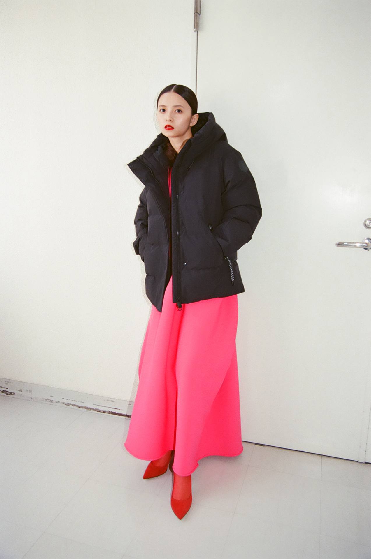 齋藤は、この機能性に富んだハイエンドなダウンを、鮮烈なフューシャピンクのドレスと合わせてモードにスタイリング。強さと華やぎを際立たせ、ドラマティックな佇まいに。