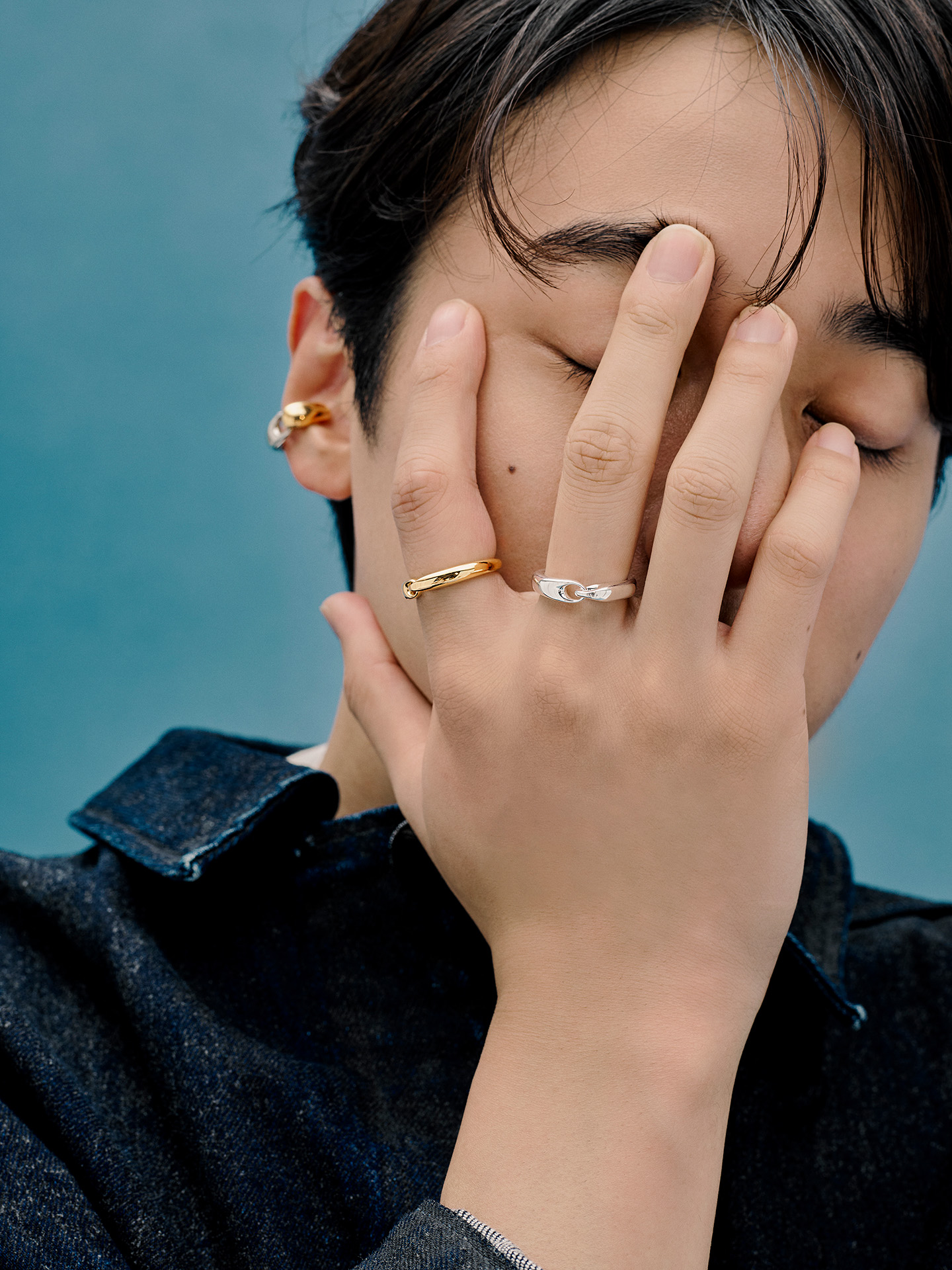 (右手人差し指)ジョージ ジェンセン リフレクト リング (YG) ¥242,000、(右手中指)ジョージ ジェンセン リフレクト リング (SI) ¥37,400/共に GEORG JENSEN (ジョージ ジェンセン)