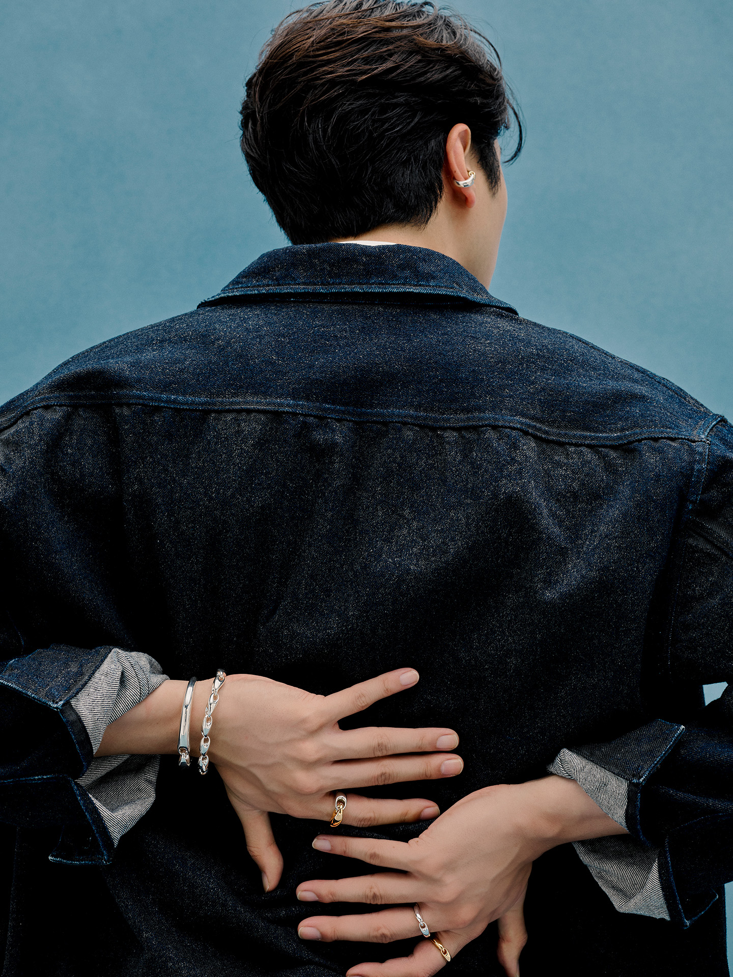 まず小関が身につけたのは、クラシックなチェーンモチーフをモダンに再解釈した「Georg Jensen Reflect (ジョージ ジェンセン リフレクト)」コレクション。Jacqueline Rabun (ジャクリーヌ・ラバン) によってデザインされた本コレクションは、彫刻的にカーブしたリンクが連なり、人と人、過去と現在、そして自己と他者とのつながりを象徴する。首元に揺れるのは、新作のネックレス。繊細なチェーンに吊り下げられたペンダントは、有機的なフォルムで時の流れを描き出す。スターリングシルバーと18K ゴールドのコントラストが、エレガンスをミニマルに昇華させている。手元には、ソリッドなバングルと本コレクションの代名詞でもあるチェーンモチーフのブレスレットをレイヤード。さらに、構築的なフォルムのリングを添えることで、モダンなムードが静かに際立つ。
