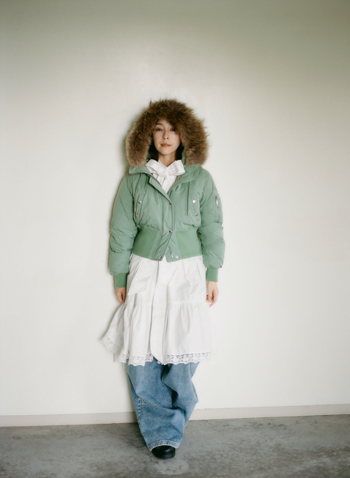 素材には、ポリエステルナイロンの割繊糸を使用したツイル地を採用。ソフトな肌触りと微起毛のテクスチャーが生むヴィンテージライクな風合いは、どんなコーディネートにも自然に馴染む。また、首元には取り外し可能なラクーンファーがあしらわれており、気候や気分に合わせてバランスを楽しみたい。