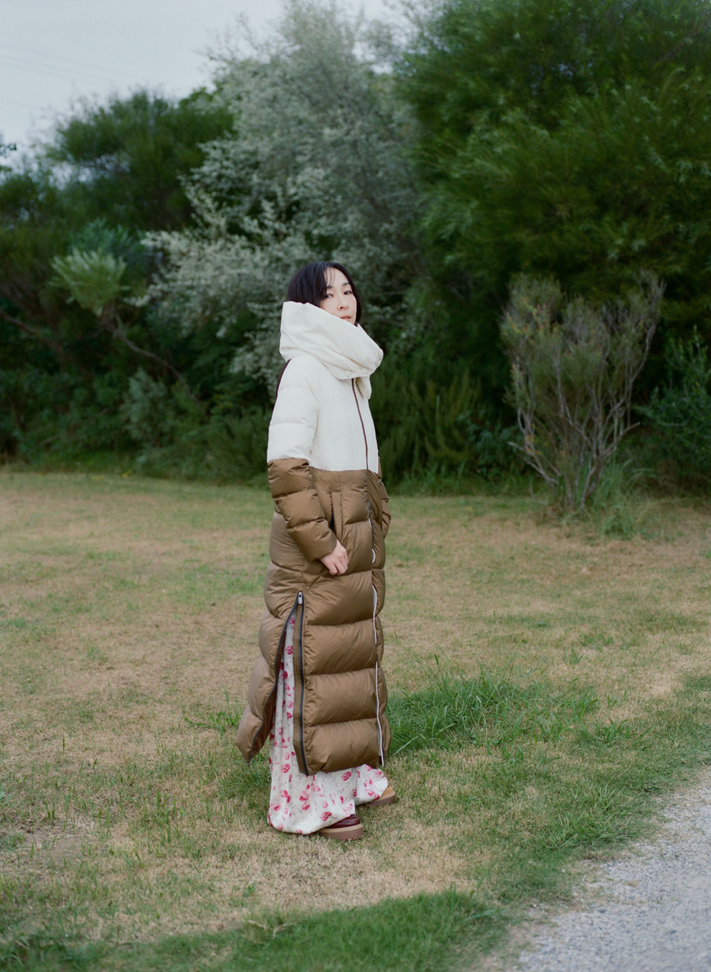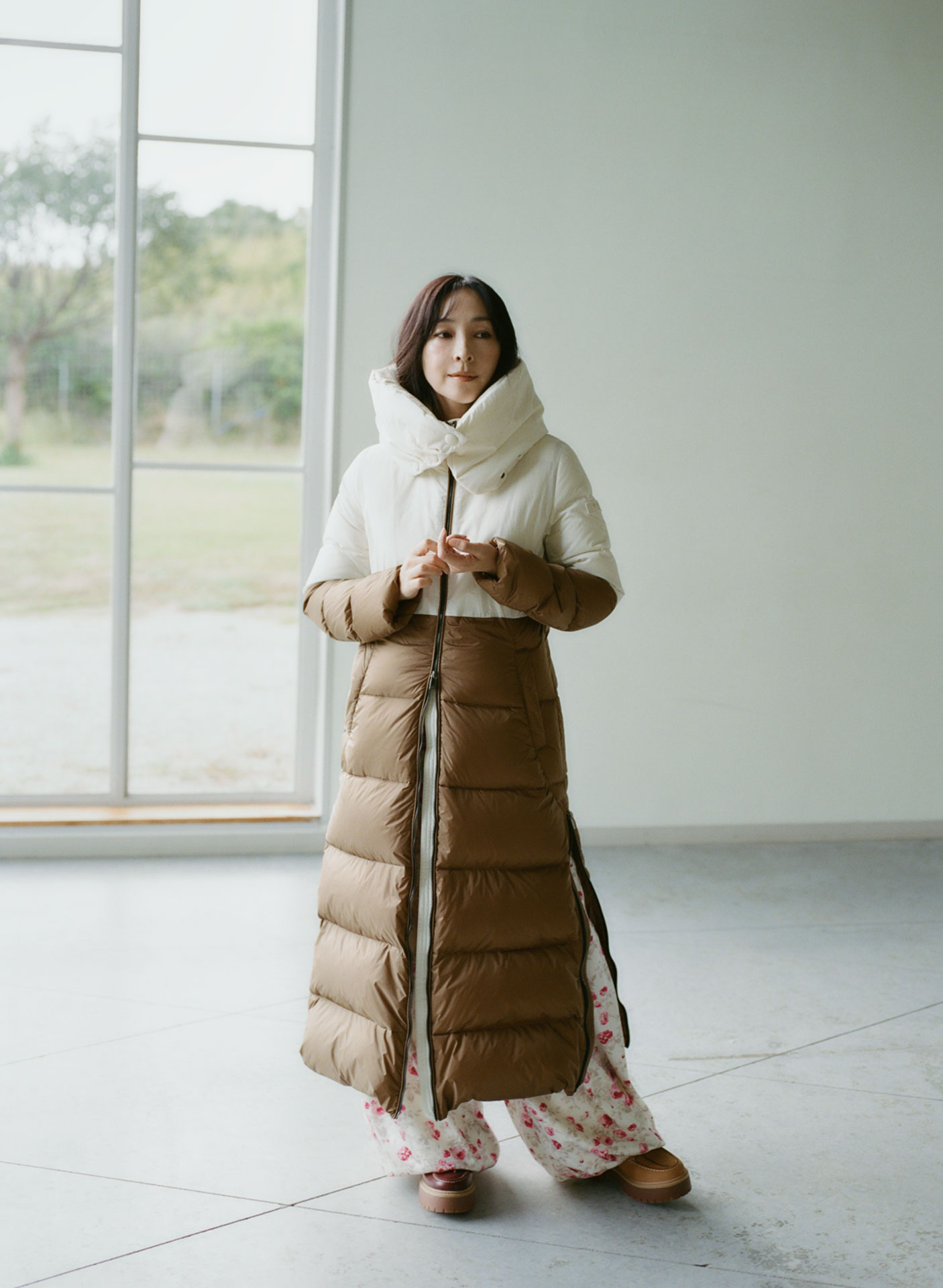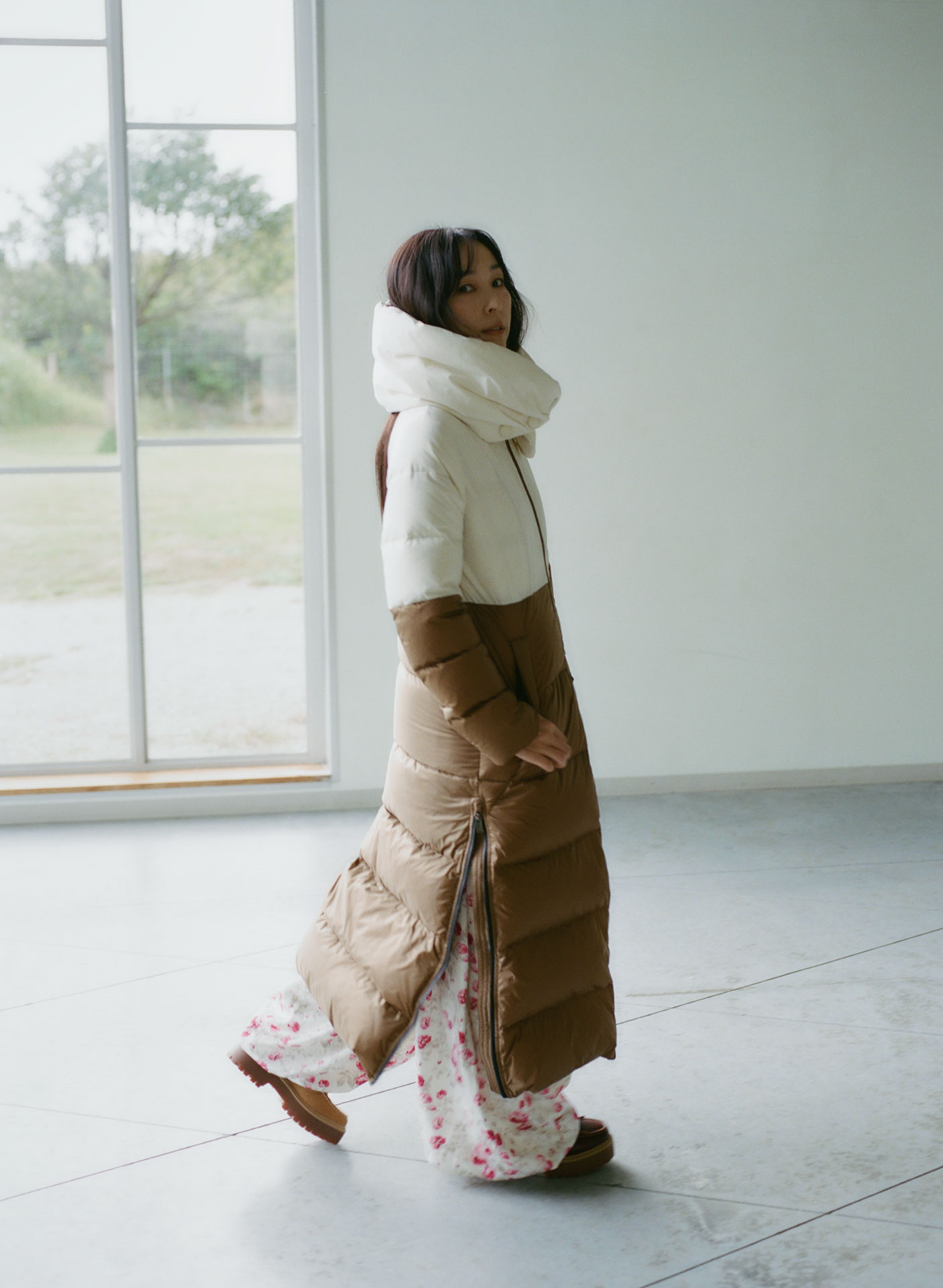 ラストを飾るのは、バイカラーの切り替えが新鮮な「DATURA (ダチュラ)」。退屈に感じてしまうロングダウンも、スタイリッシュにアップデート。細身な Iラインながら、サイドにファスナースリットを配することで、着心地は快適。異なる素材をドッキングさせることで、立体的な表情を生み出している。