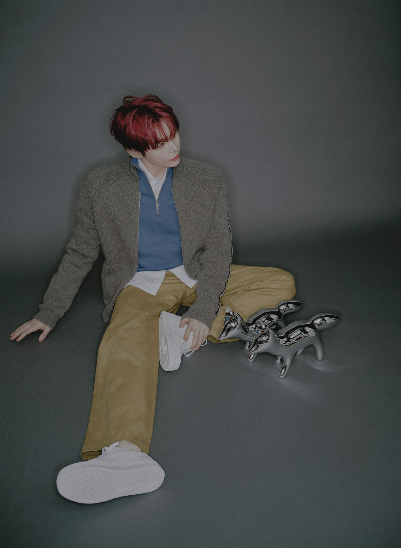 ブルーのハーフジップに、ボリュームのあるグレーカーディガンを重ねたレイヤードが、冬のファッションの醍醐味を語る。袖に配された KITSUNÉ のロゴが、プレッピーな要素をプラスオン。ゆとりのあるベージュパンツとホワイトスニーカーが、コーディネートを潔くクリーンに完成させる。