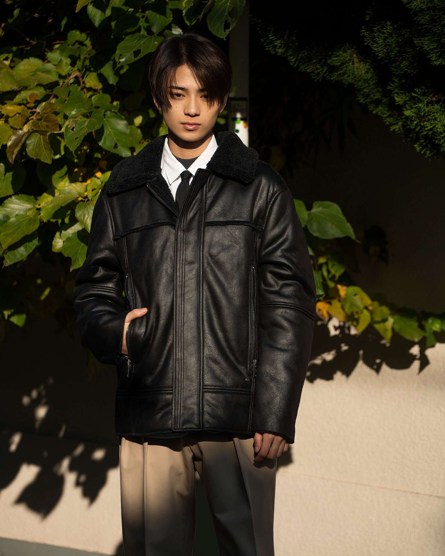 ジャケット「Thayden Luxefluff Jacket」¥44,000、ソックス ¥3,960/UGG® (アグ)、シャツ ¥27,500/KICS DOCUMENT. (キクスドキュメント)、中に着たニット ¥50,600/JOHN SMEDLEY (ジョン スメドレー)、パンツ¥33,000/NEAT (ニート)、ネクタイ/スタイリスト私物