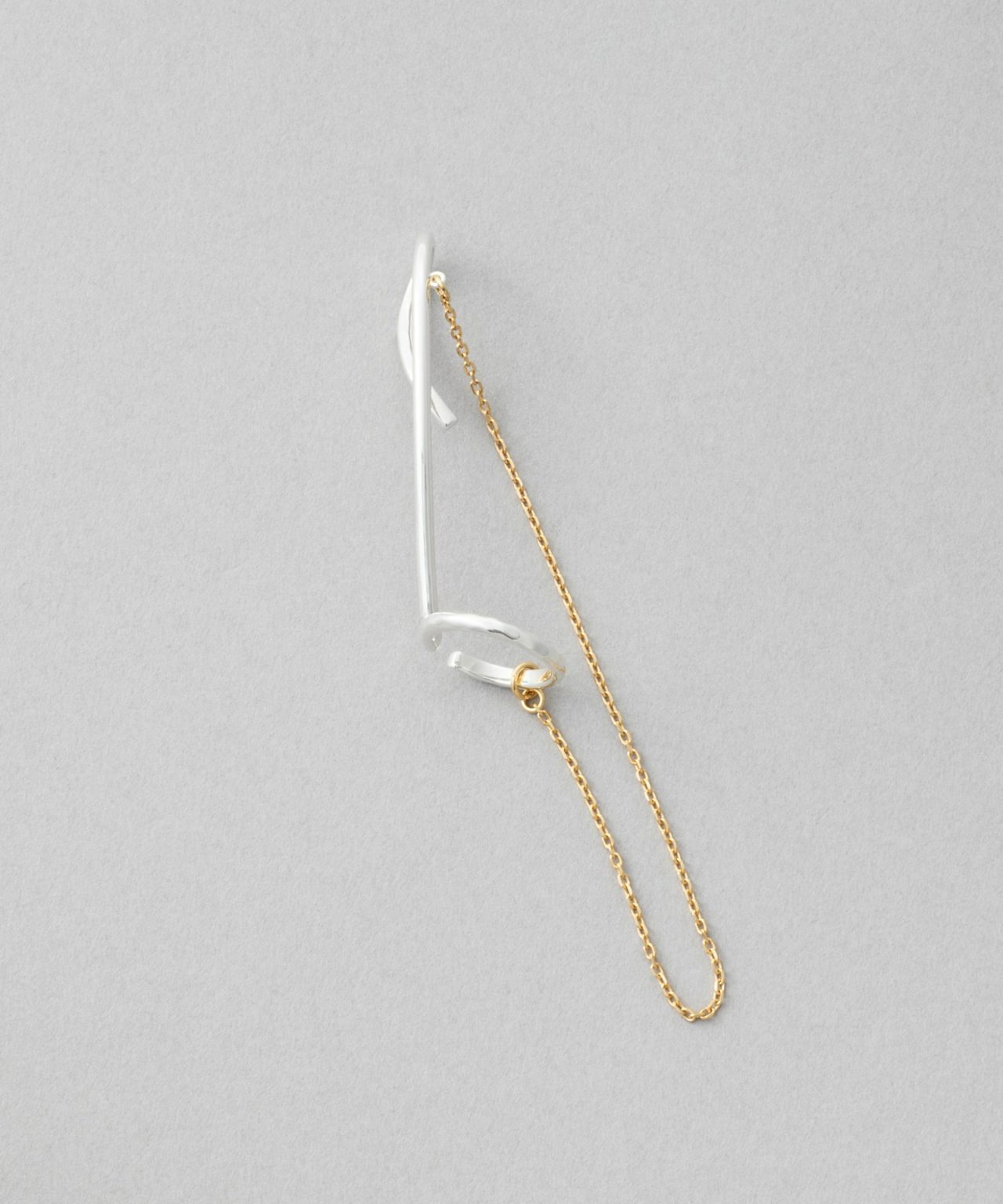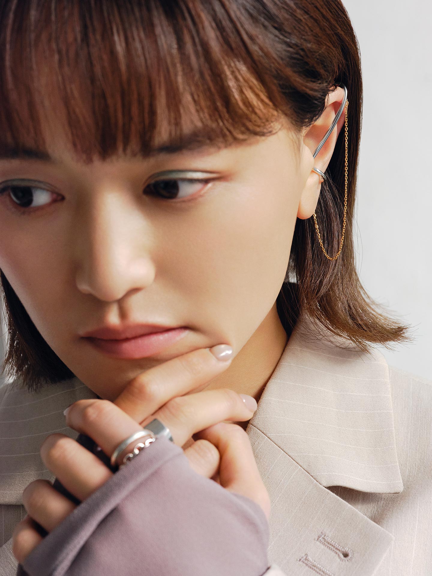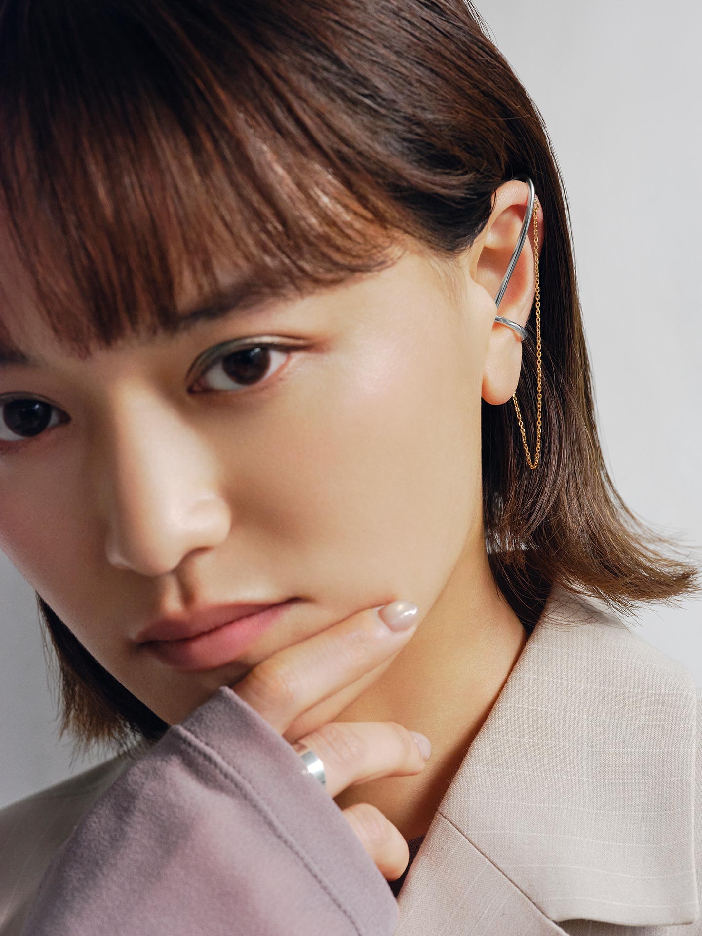 シルバーのトーンカフスにゴールドのチェーンチャームをあしらったアイテム。動くたびに揺れ動き、繊細な光を耳に宿す。トーンカフス(SV925、SV925/YGコーティング) ¥17,600、(右手中指)コネクト(SV925) ¥23,100、(左手人さし指)フォークリング(SV925) ¥15,400