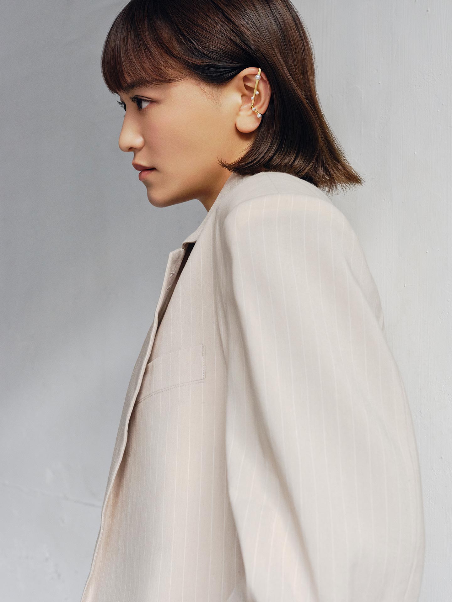 粒の大きさが異なるパールをランダムに配したデザイン。パールの持つエレガンスを、エッジの効いた平打ちのトーンカフスと合わせることでモードに昇華。さらに裏側にもパールをあしらい、横顔だけでなく、後ろ姿まで抜かりないハンサムレディに。トーンカフス(SV925/YGコーティング、貝パール) ¥20,900