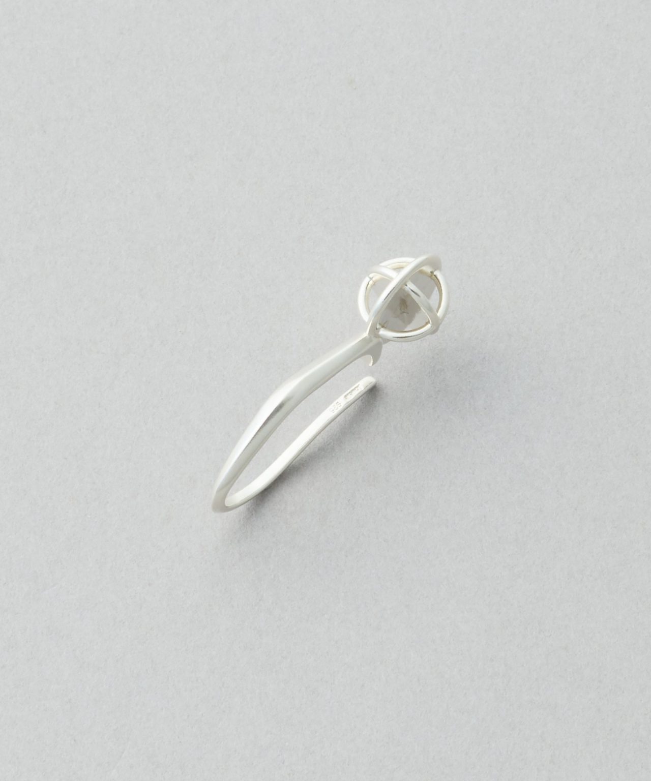 大粒のパールが印象的なデザイン。耳の内側に収まる配置にすることで華やかになりすぎず、さりげなく個性を添えてくれる。ミニマルなフォルムが、より一層イヤモニのようなテックな佇まいを際立たせる。インイヤーカフス(SV925/YGコーティング、貝パール) ¥15,400、ラリエット(SV925/YGコーティング、淡水パール、ビーズ) ¥15,400