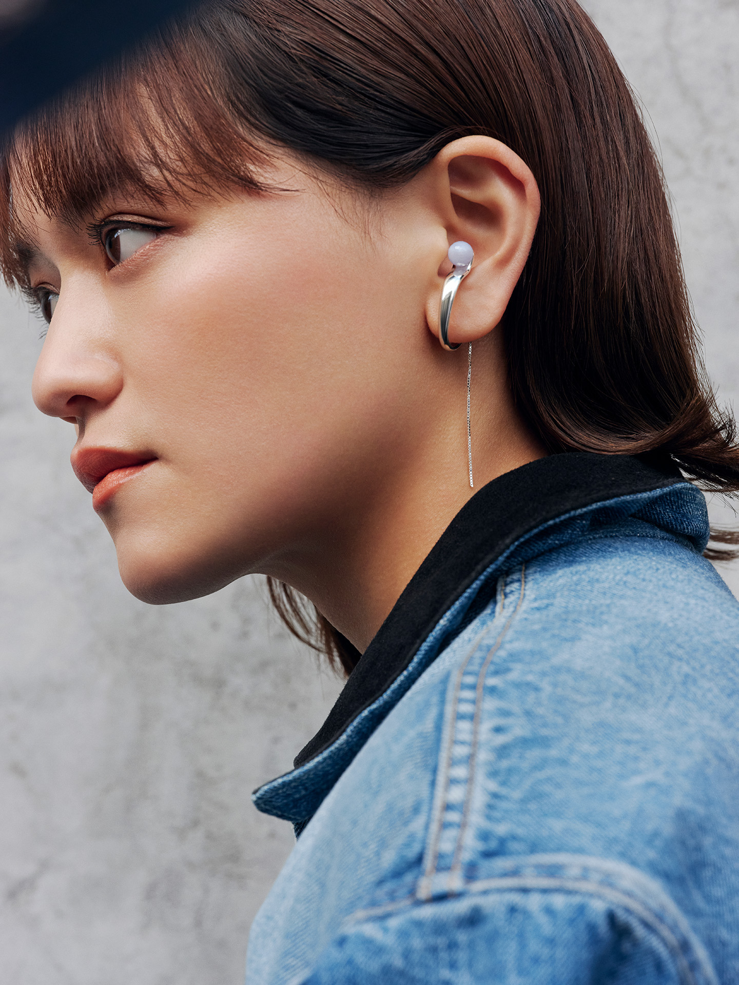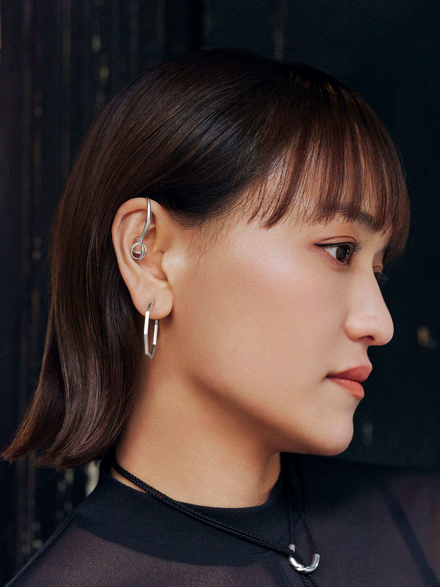 見る角度によって表情が変化するユニークなデザインも、シルバーカラーだからこそ、どんなスタイルにもなじみやすい。同じカラーのプッシュイヤリングと合わせて、耳元にさりげないエッジを添えて。インイヤーカフス(SV925) ¥12,100、プッシュイヤリング(SV925) ¥34,100、コードネック(SV925、シルク) ¥24,200