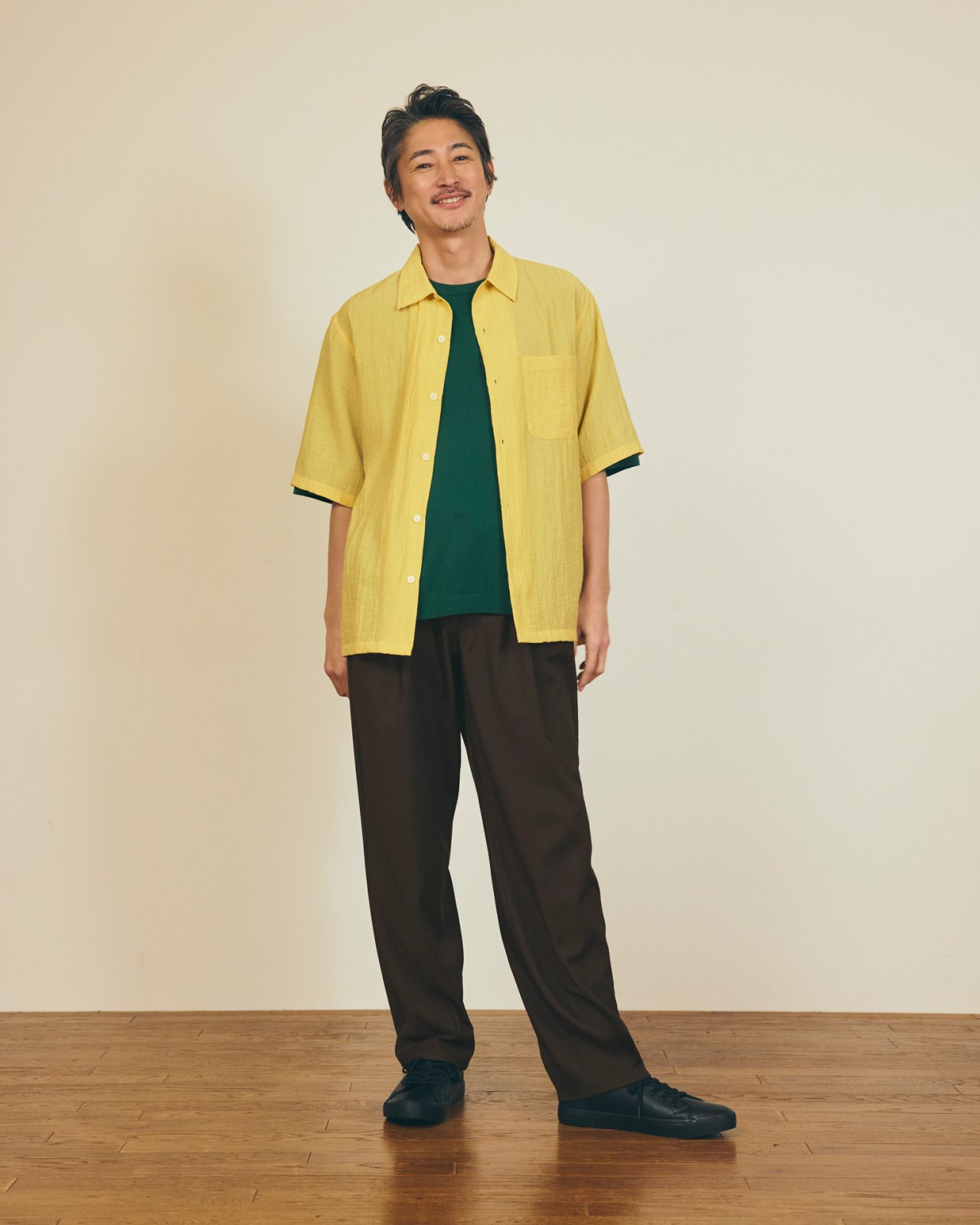 テクスチャーシャツ¥1,990、スタイルドライハイアンクルソックス¥290、ふかふかスニーカー¥1,990、キャロットスラックス (※) ¥2,990、ウォッシャブルニットT¥1,990/GU(ジーユー)