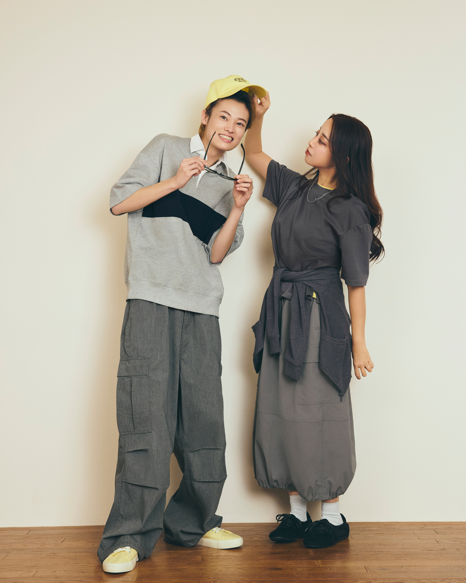 (airu)スーパーワイドカーゴパンツ¥2,990、ハイアンクルソックス(チャンキーリブ)¥290、ふかふかキャンバススニーカー¥1,990、UVカットスクエアウェリントンサングラス¥1,290、ドライワッフルT¥1,490、スウェT(ラガー)¥1,990、UVカットツイルロゴキャップ¥990/GU(ジーユー)