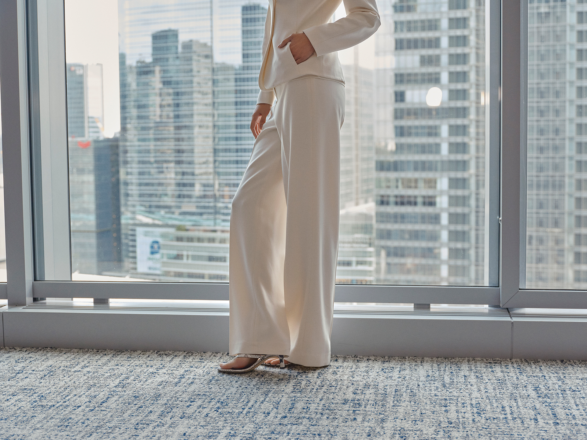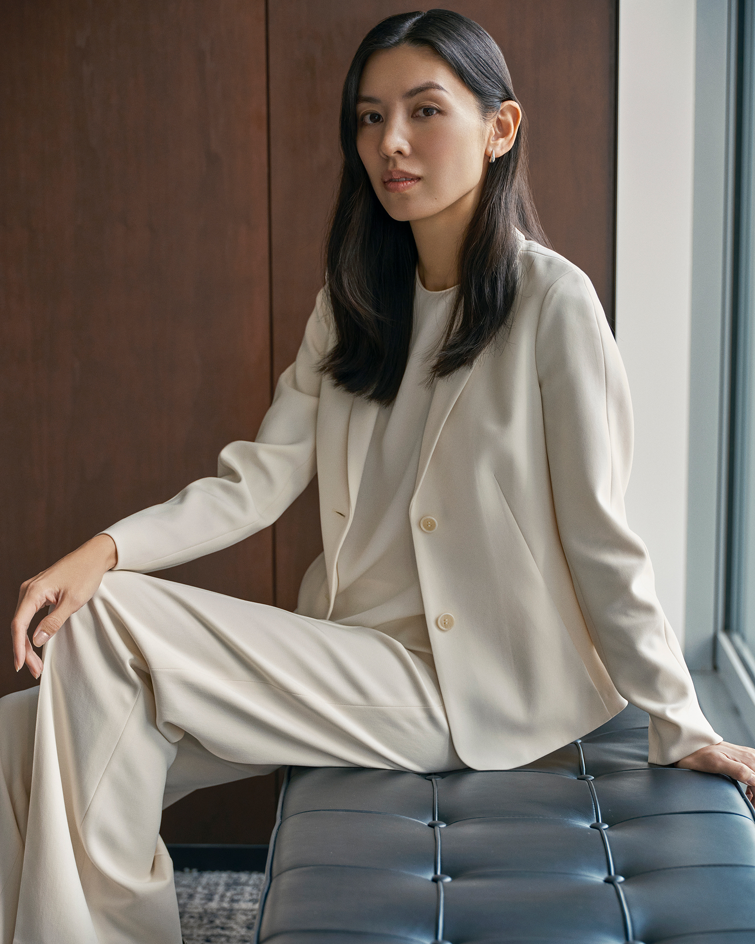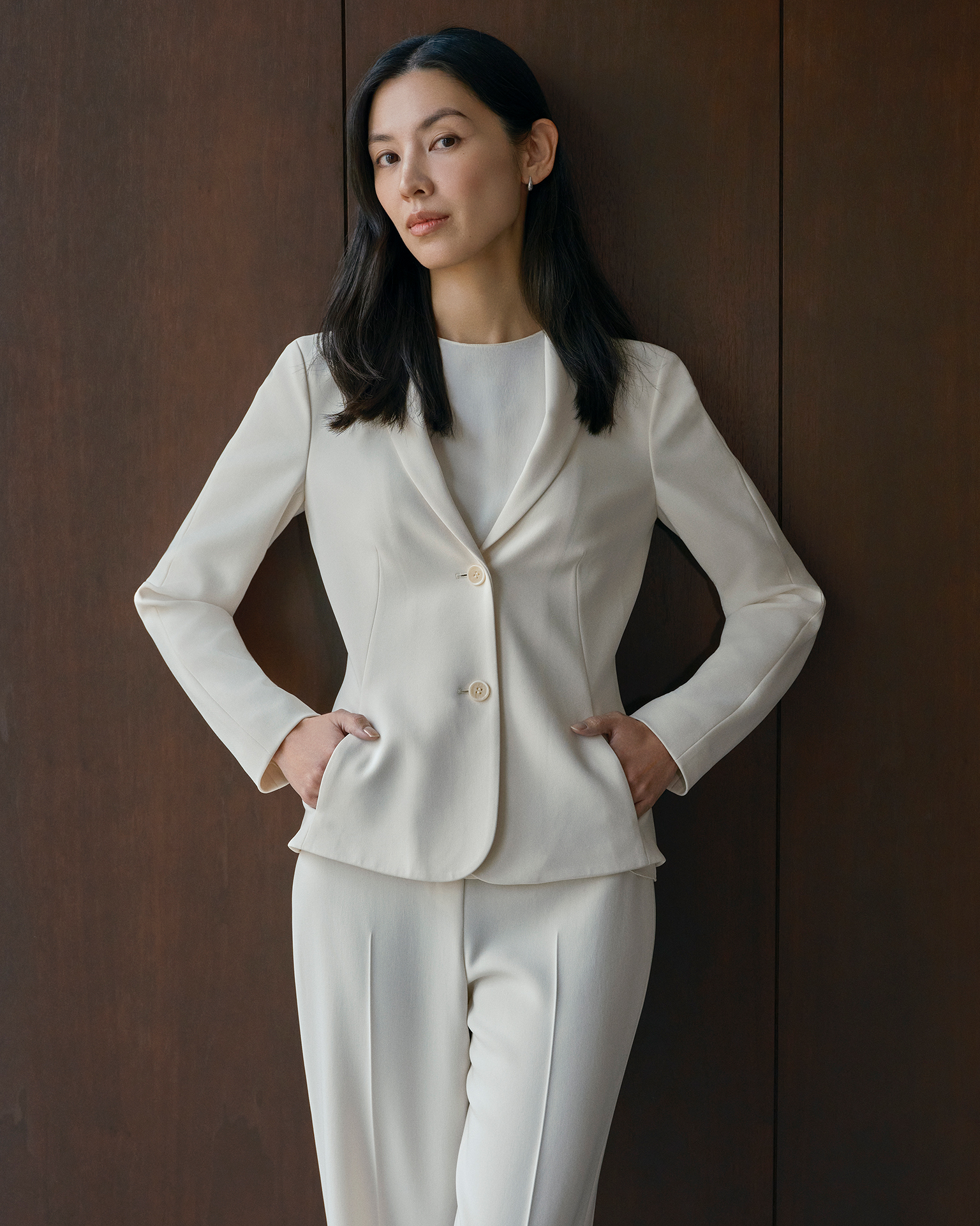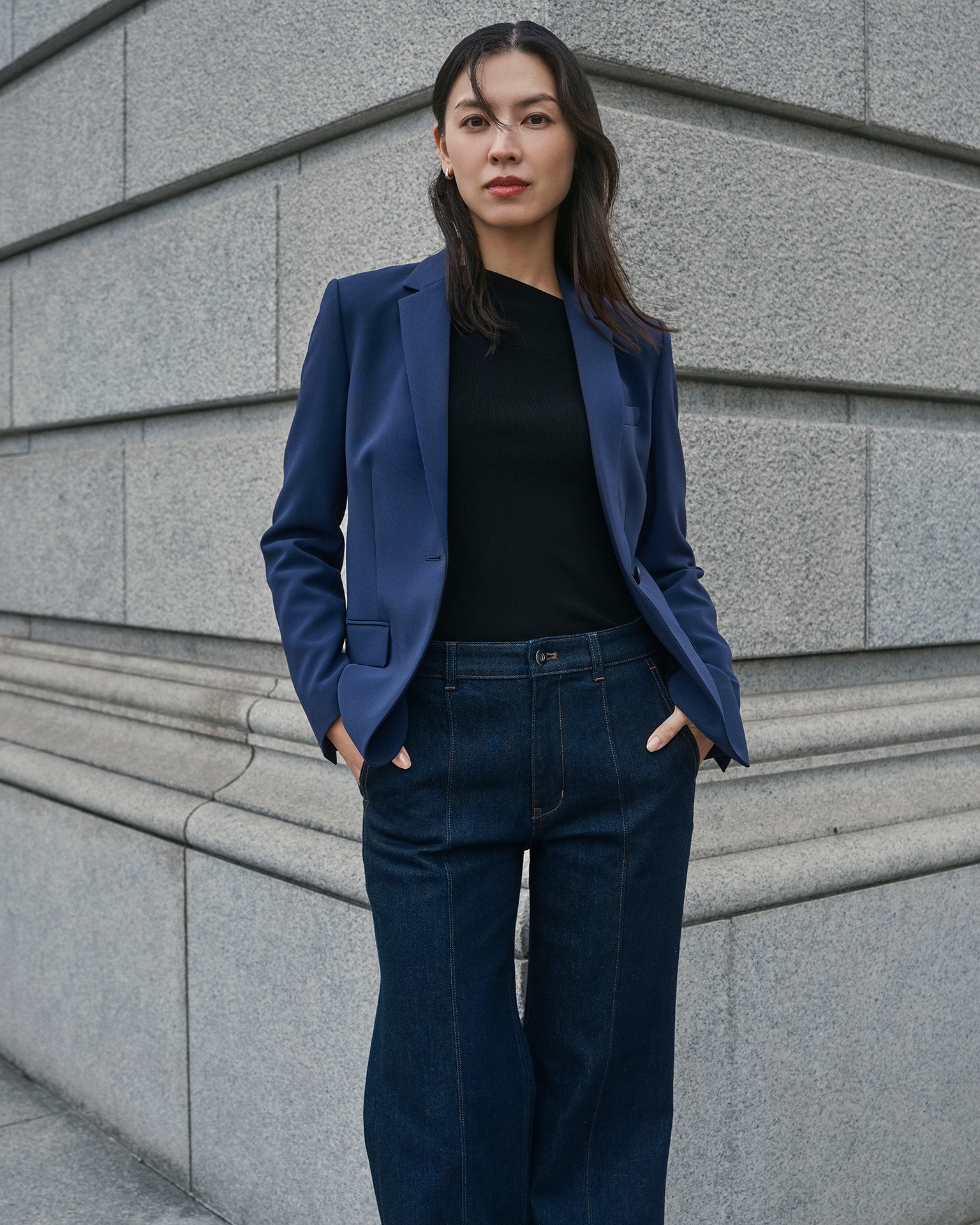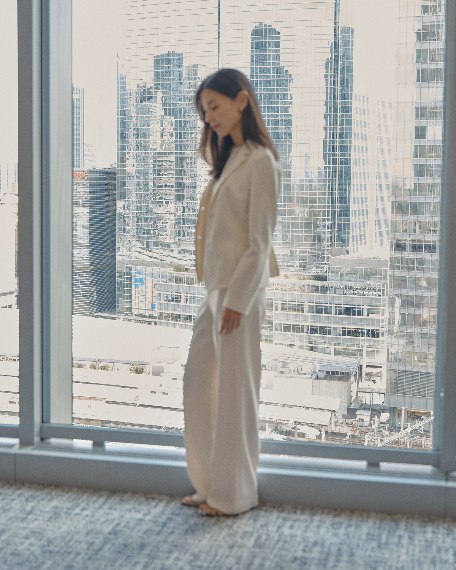 普遍的な白という色から、人は何を感じるだろう。清潔感や潔さ、気高さ、はたまた包容力……時にはストイックに、あるいは無垢な表情をのぞかせる。Theory の Admiral Crepe が湛える白は、都会的な洗練を放ちながらも、その質感にはどこか温かみが宿る。着る人の奥深さを語り、生命力を伝えてくれる色だからこそ、大切な場面にセットアップで纏いたい。申真衣が手に取ったのは、エレガントなジャケットに新作パンツ「Admiral Crepe Wide Pull On Full Length」。プルオン仕様のワイドシルエットのイージーパンツで、レッグラインを強調することなく、センタープレスが脚を細く、長く見せてくれる。程よく絞られたウエストから自然なフレアがひろがる立体的なジャケットは、ビジネスやフォーマル、オンからオフまでシーンを選ばないデザイン。 デニムパンツでカジュアルダウンし、インナーにはワンショルダーのカットソーを合わせれば、印象が全く変わり、現代女性の持つ余裕が香り立つ。
