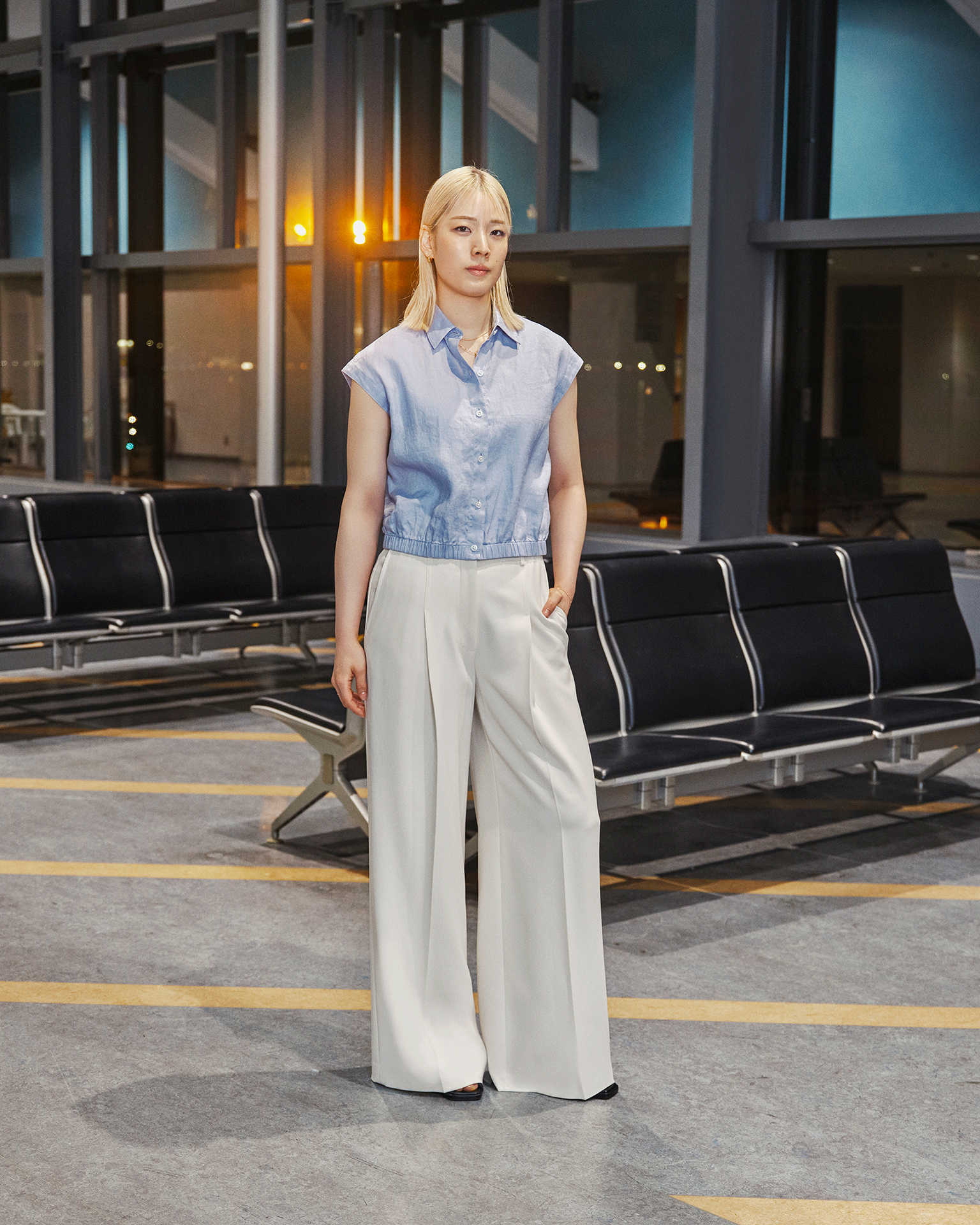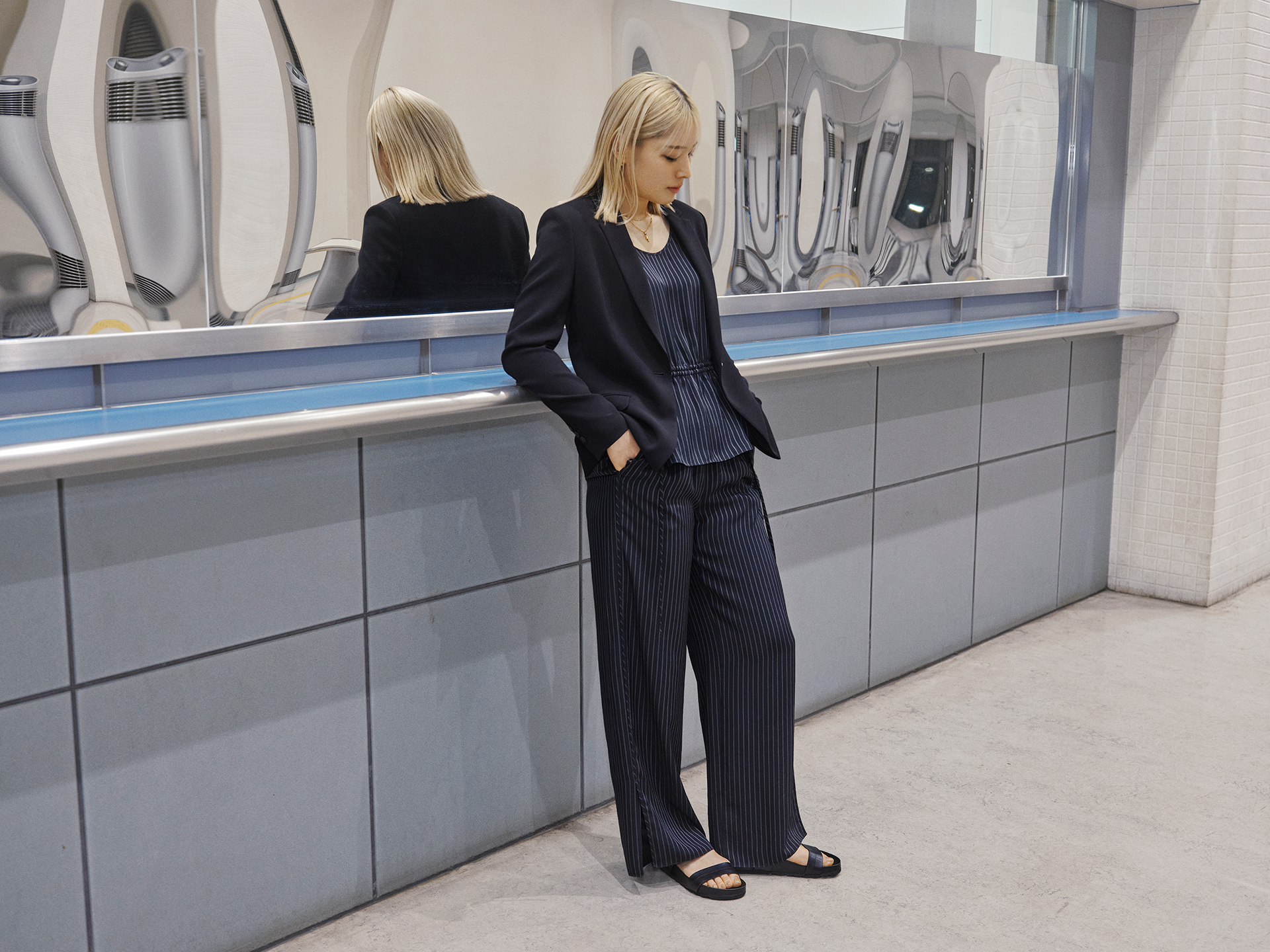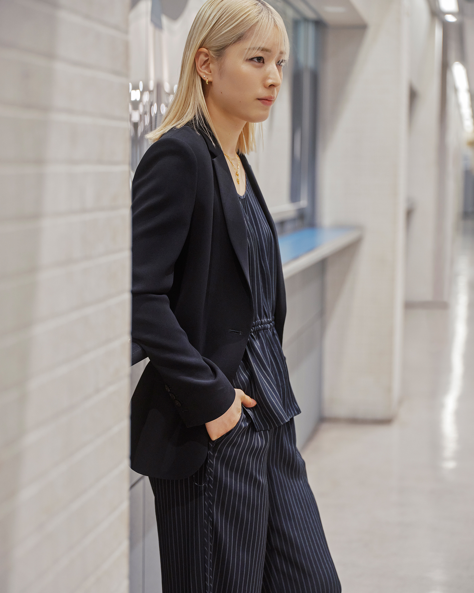 遠征や練習試合など、世界中を飛び回る江村。多忙な日々を過ごす彼女にとって、ファッションは時に自分を鼓舞する勝負服となり、時に心を解き放つかけがえのない喜びとなる。ブラックを基調としたシックな装いから、明るいトーンのカジュアルなコーディネートまで、幅広い着こなしを見せてくれた。マスキュリンなピンストライプのセットアップには、Adminal Crepe のジャケットをON。ミニマルなシングルのテーラードジャケットは、ビジネスからフォーマル、カジュアルなシーンまで様々なシーンに対応。軽くてシワにならず、シーズンレスに着ることができる。また、ホワイトの「Admiral Crepe Oversized Pleated Trouser」には、ノースリーブのコンパクトなシャツをセレクト。なめらかで高級感のある素材感を活かして、コントラストやバランスでスタイリングを楽しみたい。