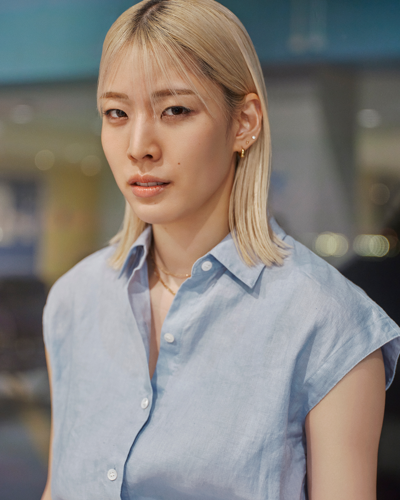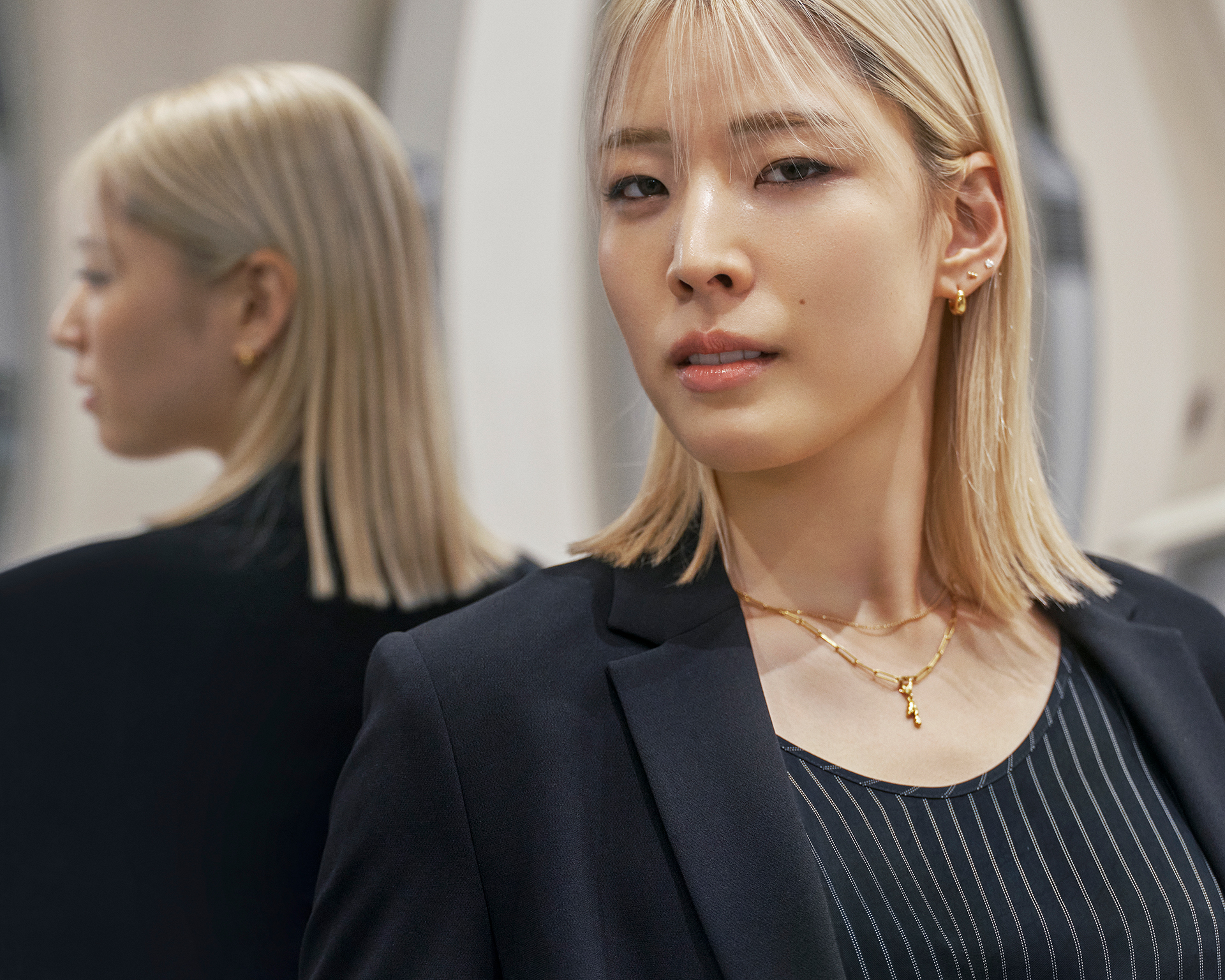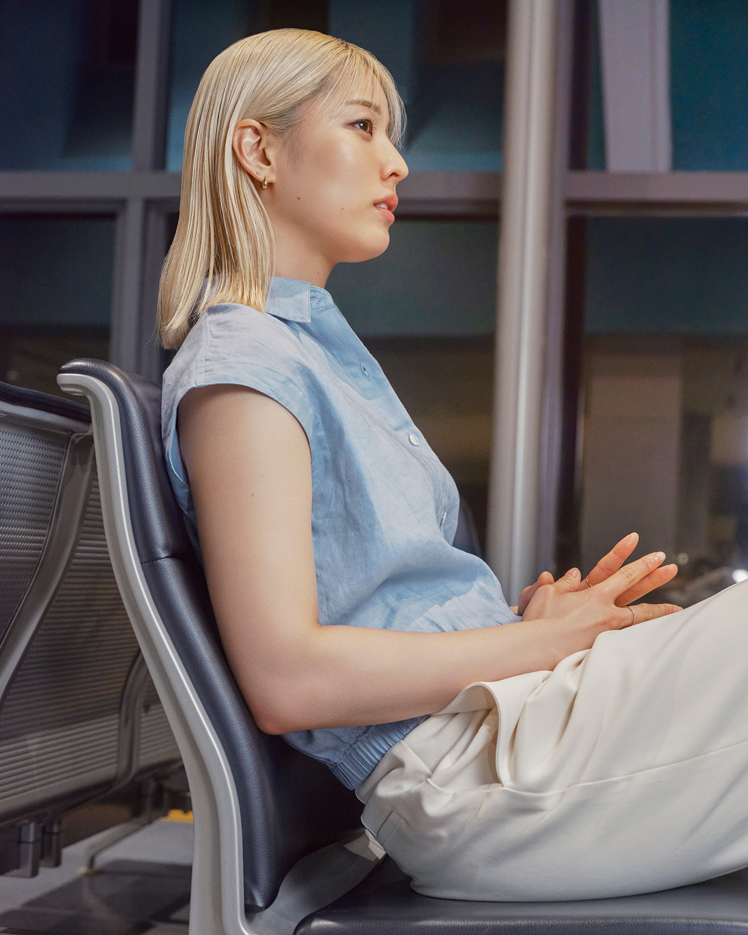 遠征や練習試合など、世界中を飛び回る江村。多忙な日々を過ごす彼女にとって、ファッションは時に自分を鼓舞する勝負服となり、時に心を解き放つかけがえのない喜びとなる。ブラックを基調としたシックな装いから、明るいトーンのカジュアルなコーディネートまで、幅広い着こなしを見せてくれた。マスキュリンなピンストライプのセットアップには、Adminal Crepe のジャケットをON。ミニマルなシングルのテーラードジャケットは、ビジネスからフォーマル、カジュアルなシーンまで様々なシーンに対応。軽くてシワにならず、シーズンレスに着ることができる。また、ホワイトの「Admiral Crepe Oversized Pleated Trouser」には、ノースリーブのコンパクトなシャツをセレクト。なめらかで高級感のある素材感を活かして、コントラストやバランスでスタイリングを楽しみたい。