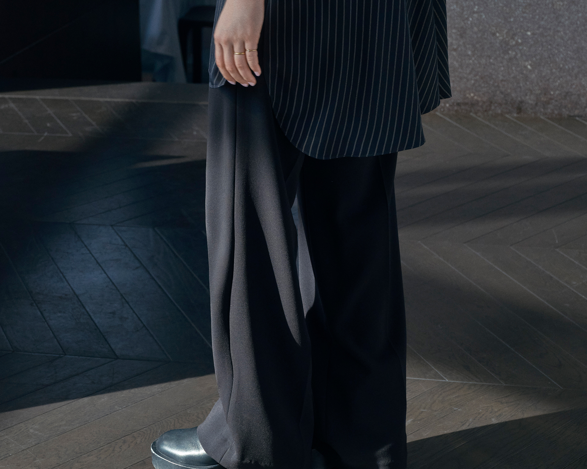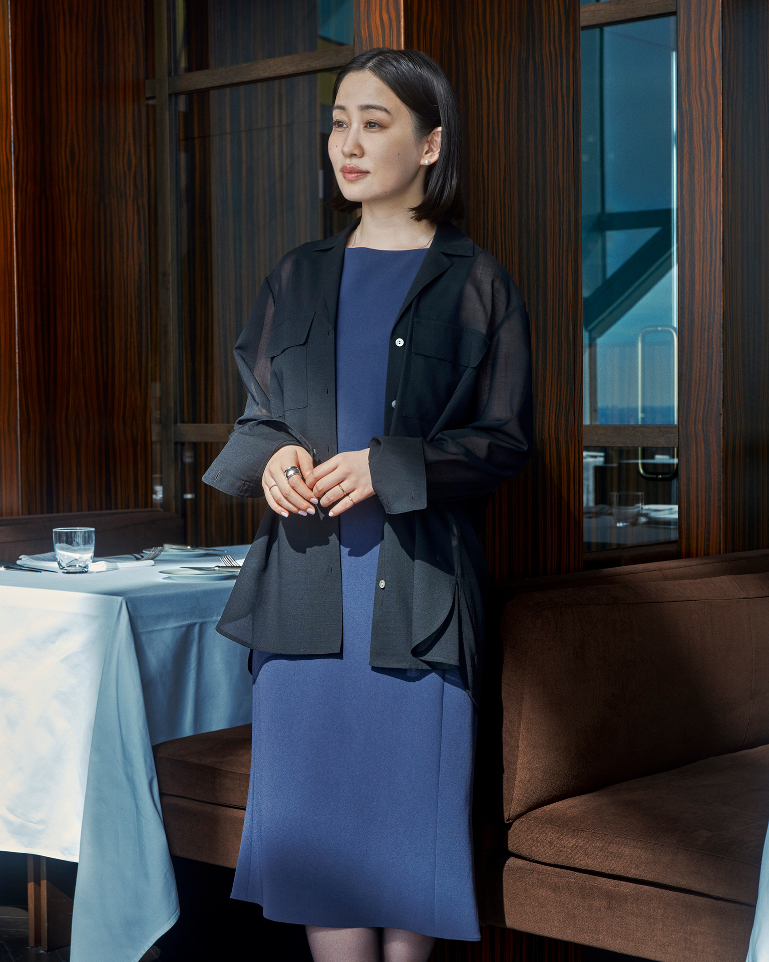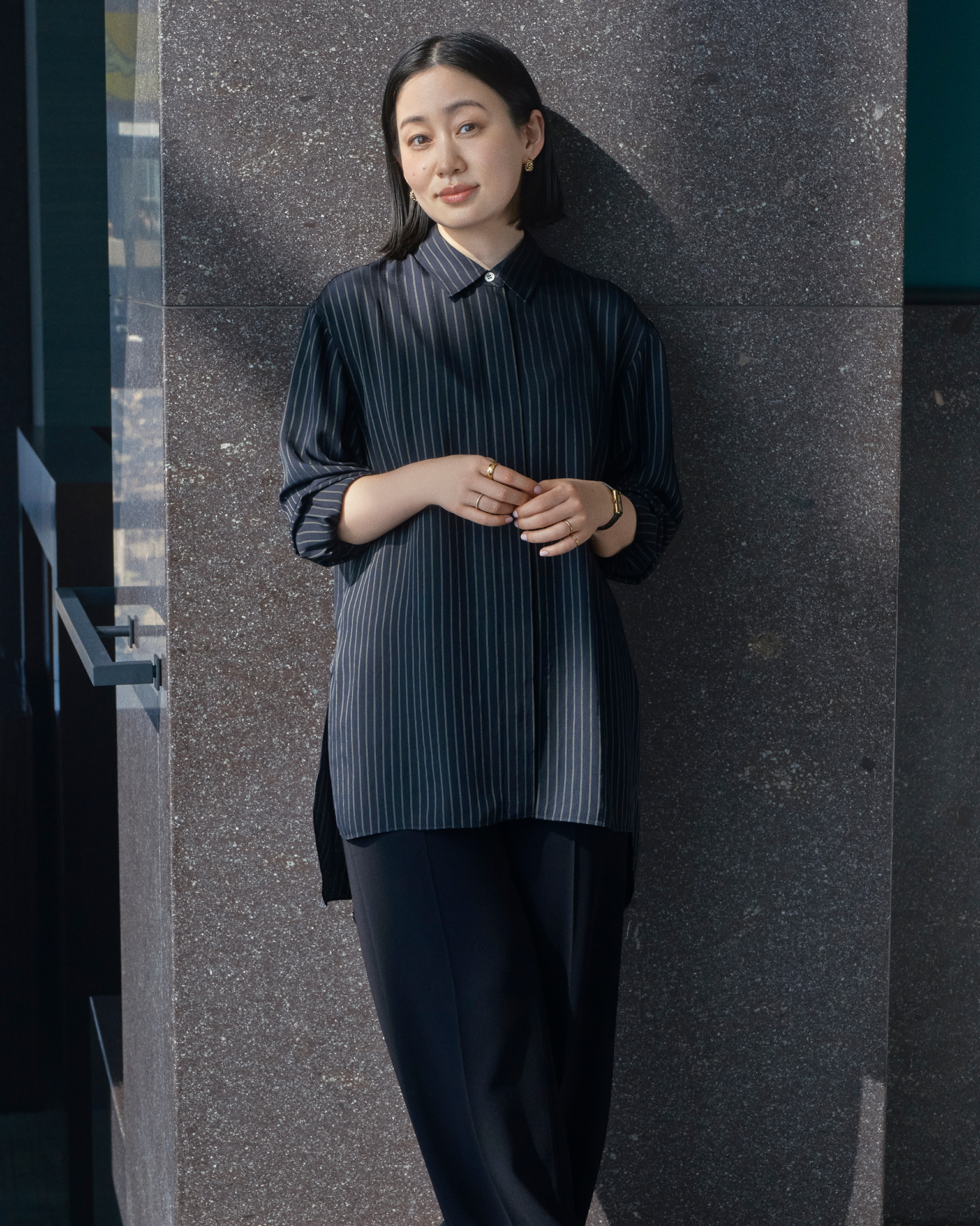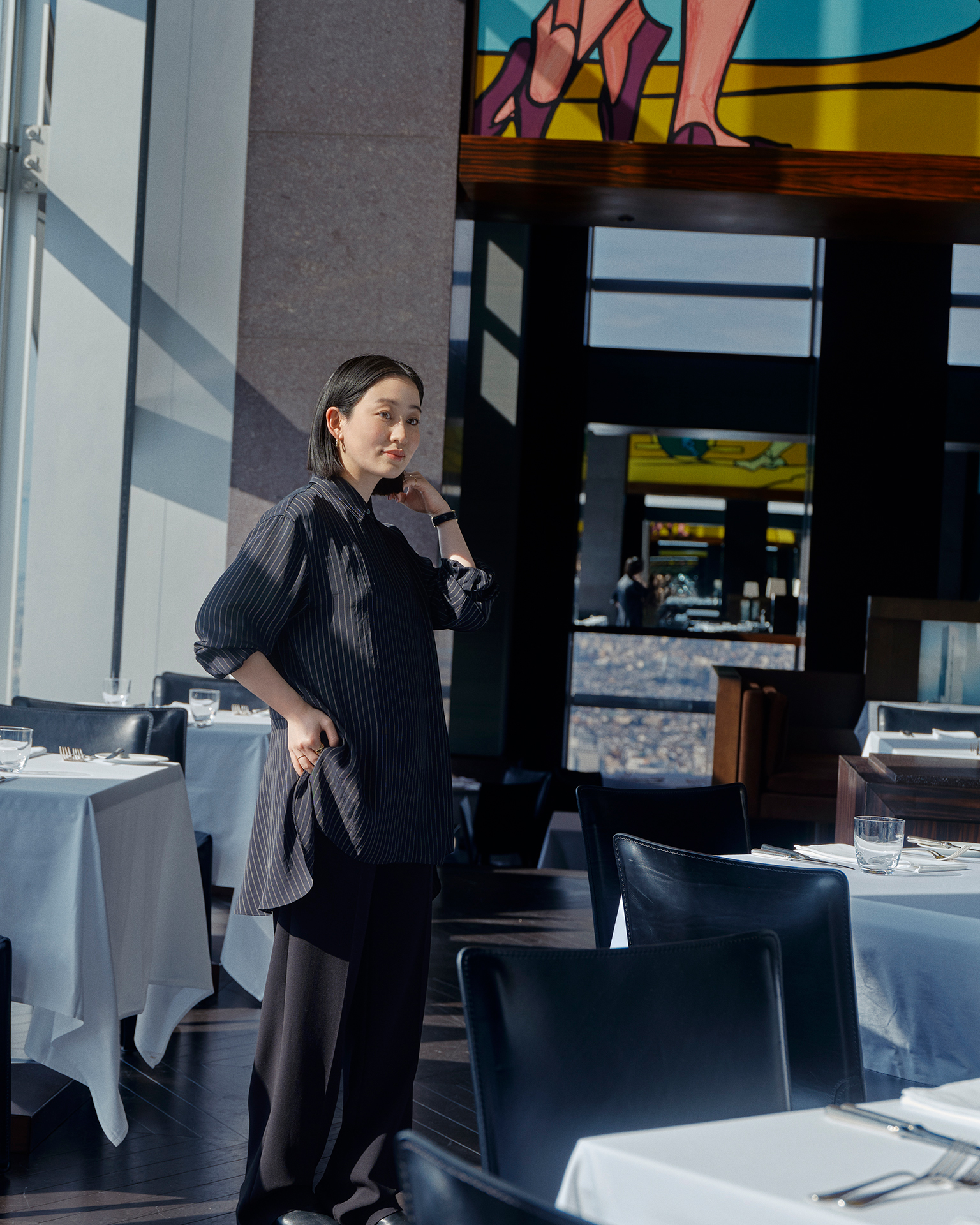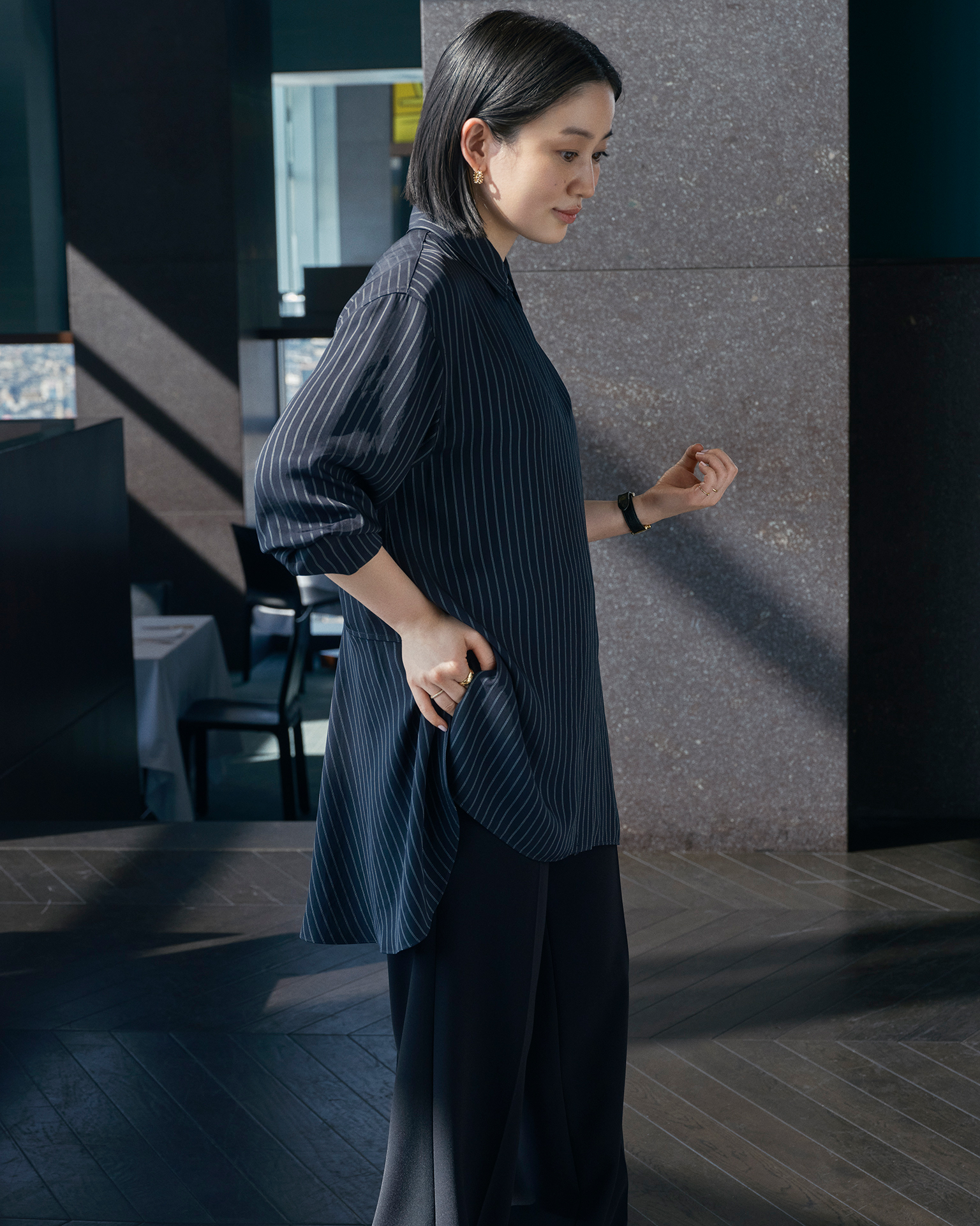 Theory のルーツがニューヨークだと聞いて平野の頭にすぐ浮かんだのは、最近リニューアルオープンしたばかりのパーク ハイアット 東京の「ニューヨーク グリル」。ダイナミックなパノラマビューを望むここには、Theory の服づくりとも通じる、確かな哲学、洗練とあたたかさが宿っている。家族や友人たちとのカジュアルなランチから、大切な人とのロマンティックなディナーまで、Theory の Admiral Crepe はどんな瞬間にもフィットする。バックスタイルでエレガントにドレープを描くピンストライプのシャツに、「Admiral Crepe Wide Pull On Full Length」を合わせて、リラックスしたムードを演出しながらも、現代女性のコンテンポラリーなスタイルを反映させる。また、Admiral Crepe のドレスは、エレガントなマーメイドラインと首元をすっきり見せるボートネックが特徴。同素材のジャケットを合わせても、平野のようにシースルーシャツなどでカジュアルダウンしてもよし。シンプルなデザインだからこそ、どこまでもアレンジのイマジネーションが広がる。