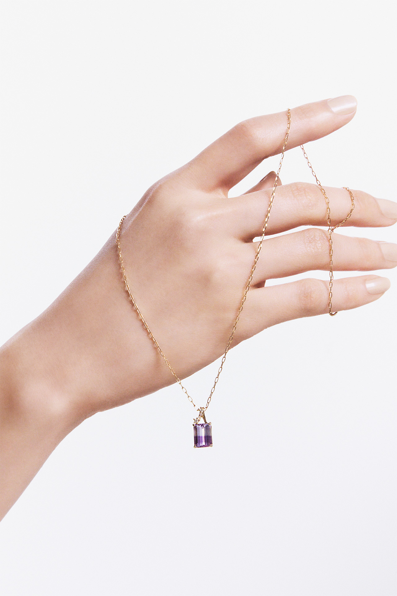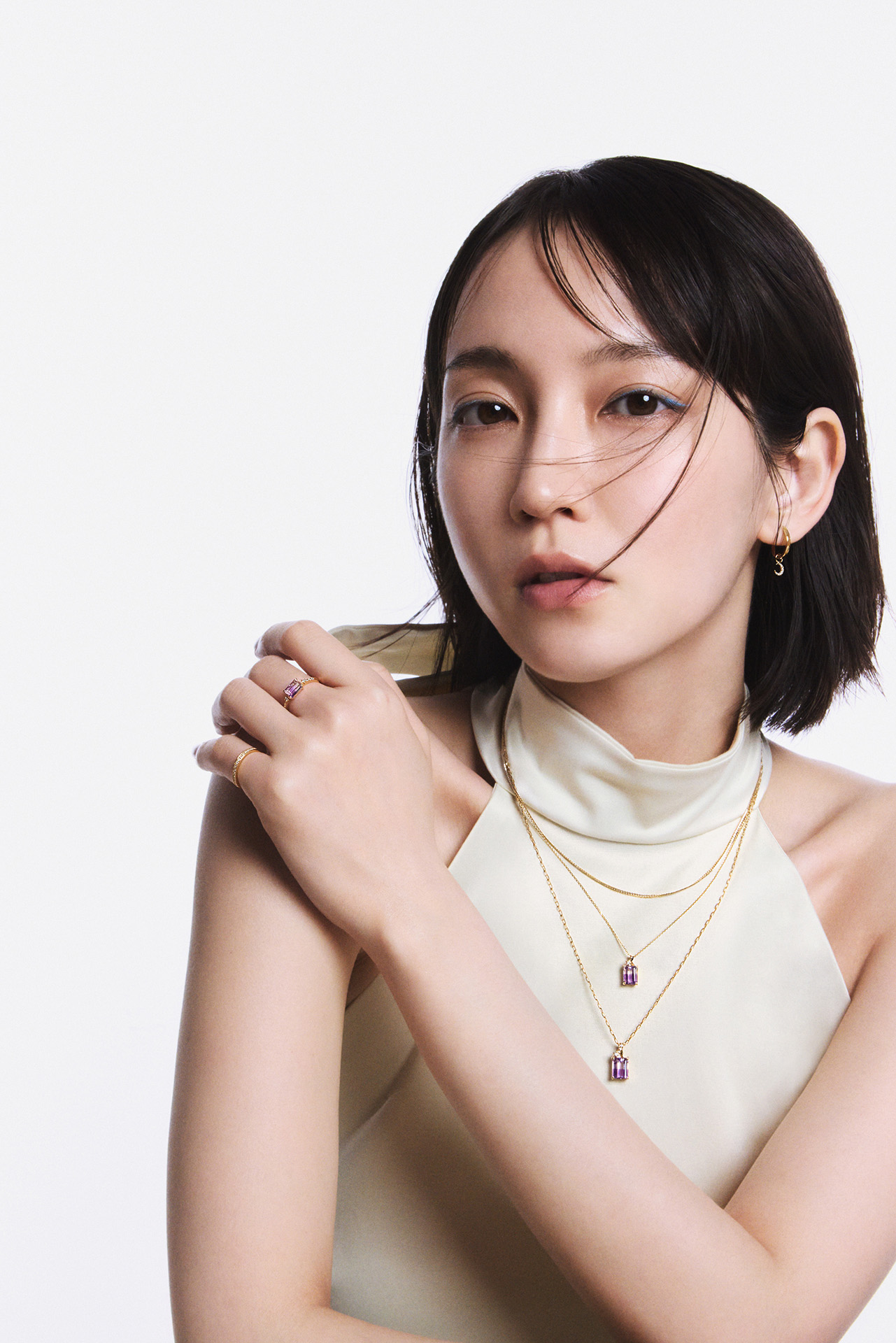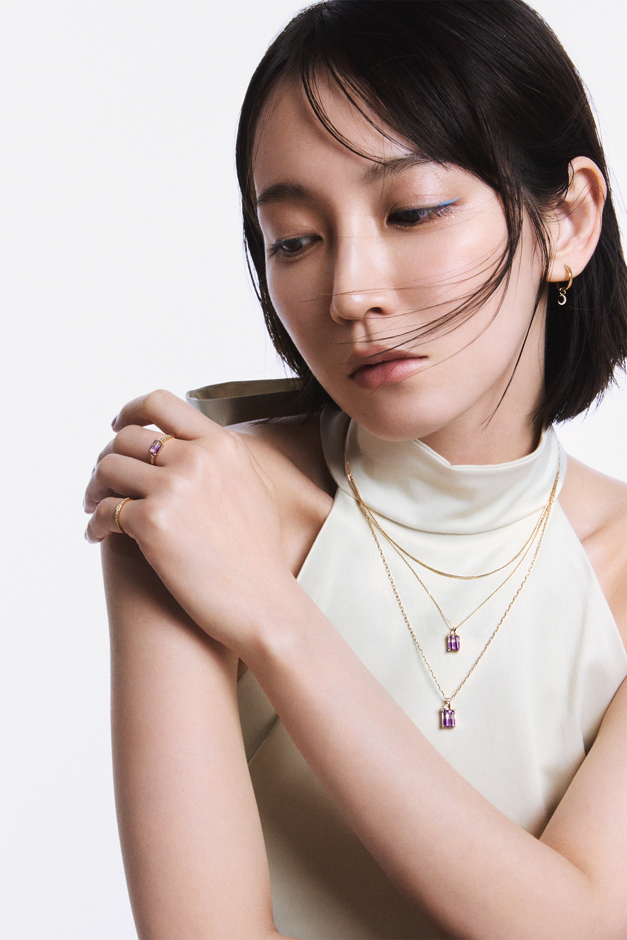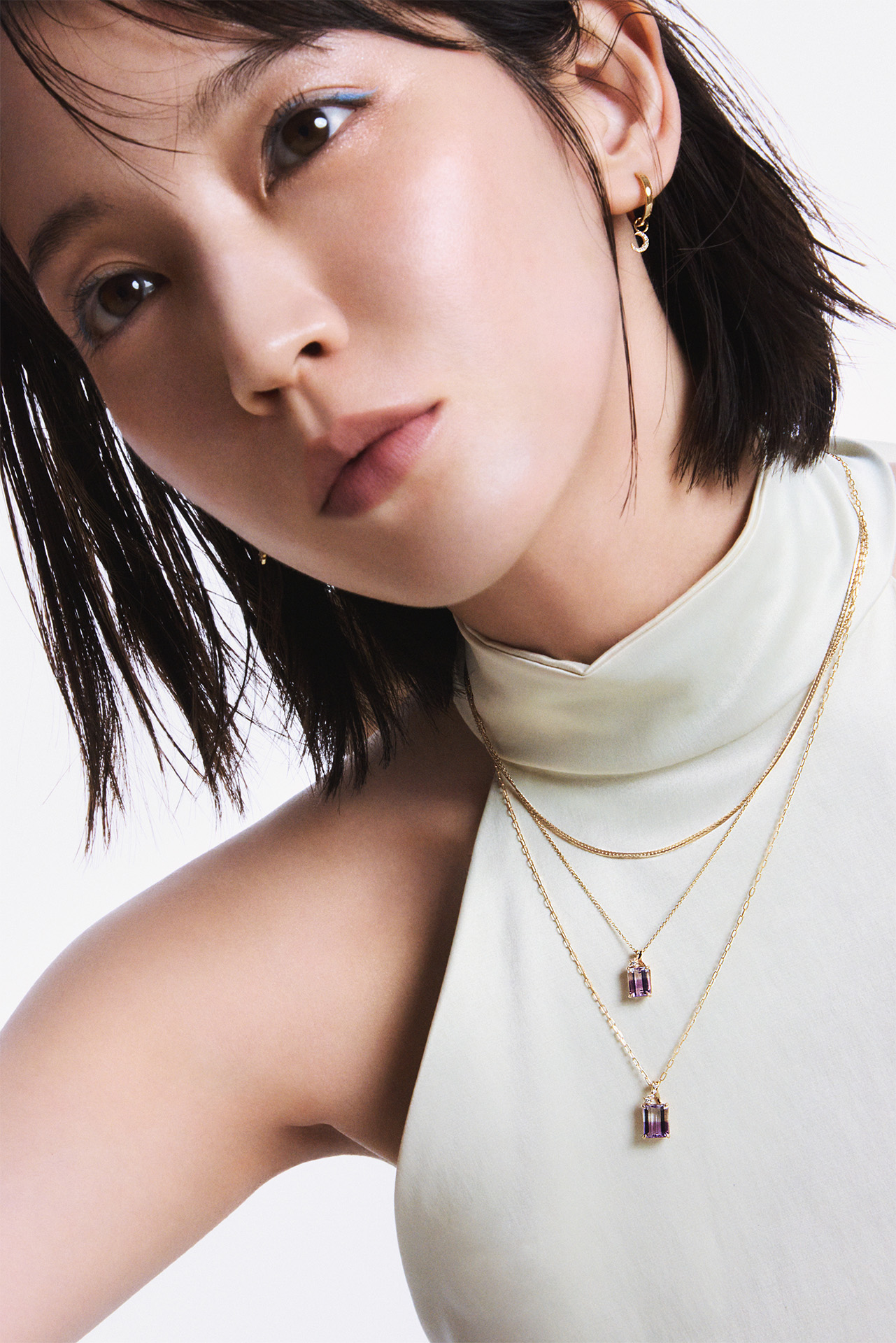 (首元 下から)チャーム「LUCENT VIOLET」(K10YG バイカラーアメシスト ダイヤモンド) ¥82,500、チェイン(K10YG)¥93,500、チャーム「LUCENT VIOLET」(K10YG バイカラーアメシスト ダイヤモンド) ¥ 60,500、チェイン(K10YG)¥51,700、チェイン(10KYG ダイヤモンド)¥102,300、(左耳)シングルピアス(K10YG)¥55,000、チャーム(K18YG ダイヤモンド)¥33,000、(右耳)シングルピアス(K10YG)¥55,000、チャーム(K18YG ダイヤモンド)¥35,200/すべて STAR JEWELRY(スタージュエリー)