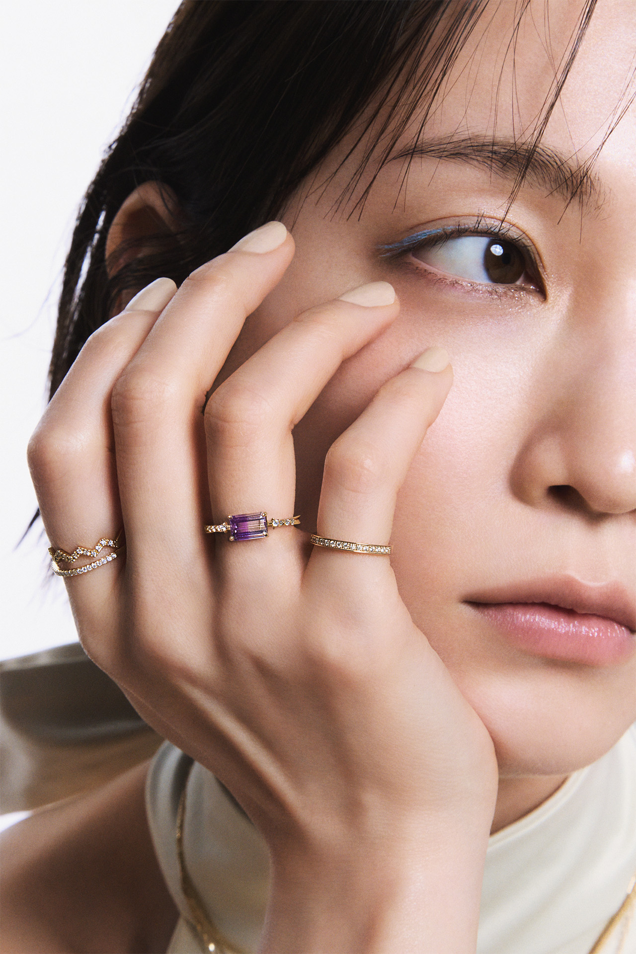 (手元 薬指)リング「LUCENT VIOLET」(K10YG バイカラーアメシスト ダイヤモンド) ¥121,000、(小指)リング(K10YG ダイヤモンド)¥84,700、(人差し指 上から)リング(K18YG ダイヤモンド)¥148,500、リング(K18YG ダイヤモンド)¥ 132,000/すべて STAR JEWELRY(スタージュエリー)